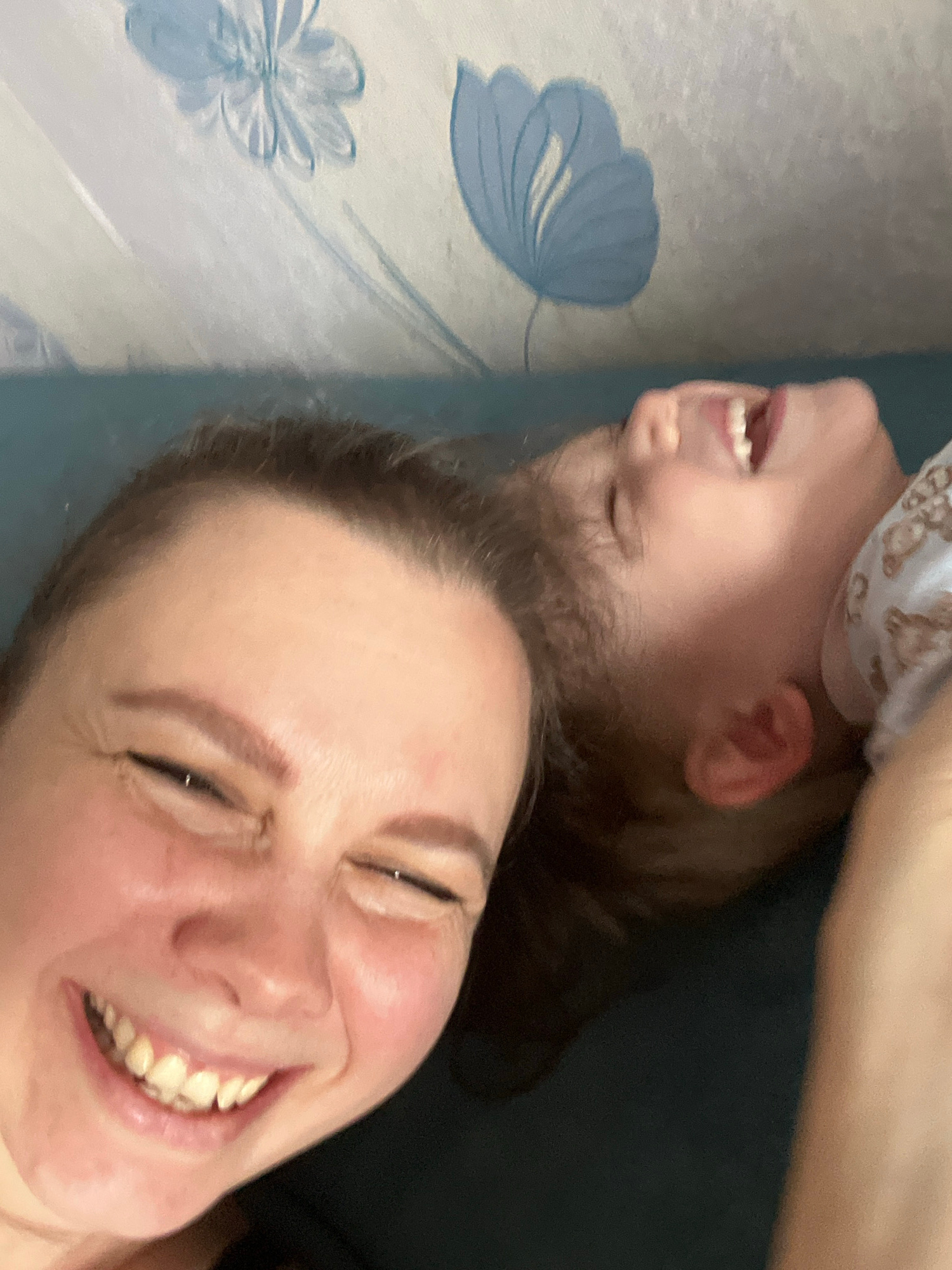 A selfie taken indoors shows a woman and a child. The woman is in the foreground with a broad smile, revealing her teeth. Above her, oriented upside down, is a child with an open mouth, also possibly…read more