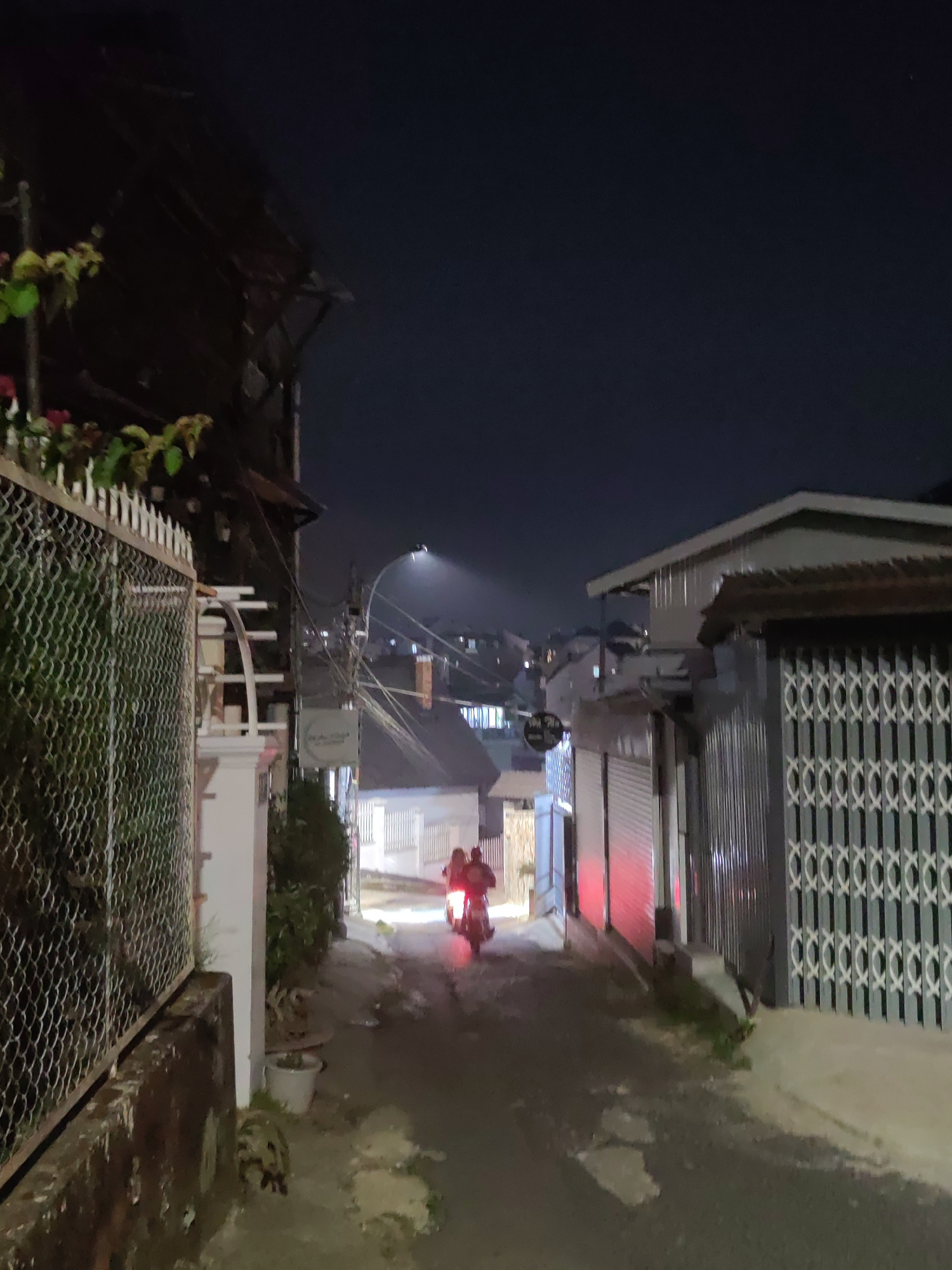 A narrow street scene at night in Da Lat, Vietnam. A motorcycle with two riders approaches the viewer in the distance. The street is flanked by buildings, with gated structures on the right side. Foliβ¦read more