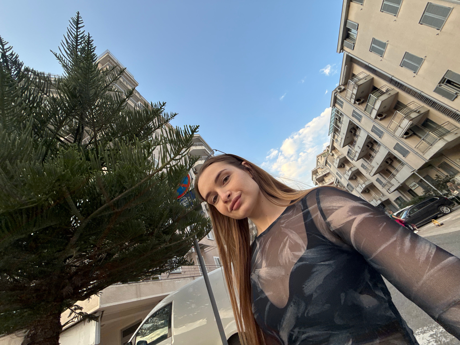 A low-angle selfie depicts a young woman in an urban setting. She wears a black, sheer, long-sleeved top. Her long, light brown hair hangs down to her chest. She looks directly at the camera with a sl…read more