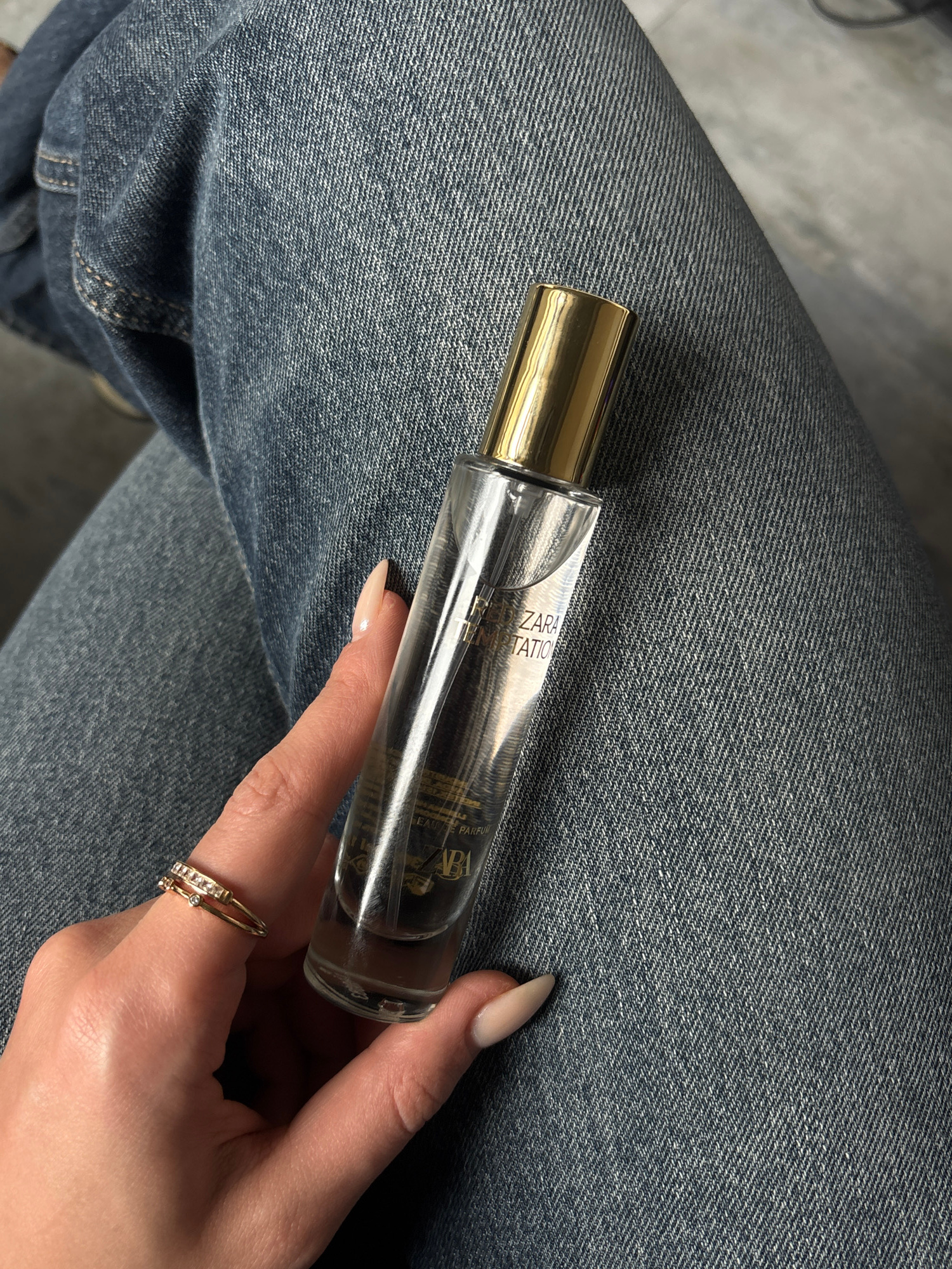 The image shows a person's hand holding a bottle of perfume on a denim-covered surface. The bottle has a gold-colored cap and clear body with a label. The person is wearing a gold-colored ring. The de…read more