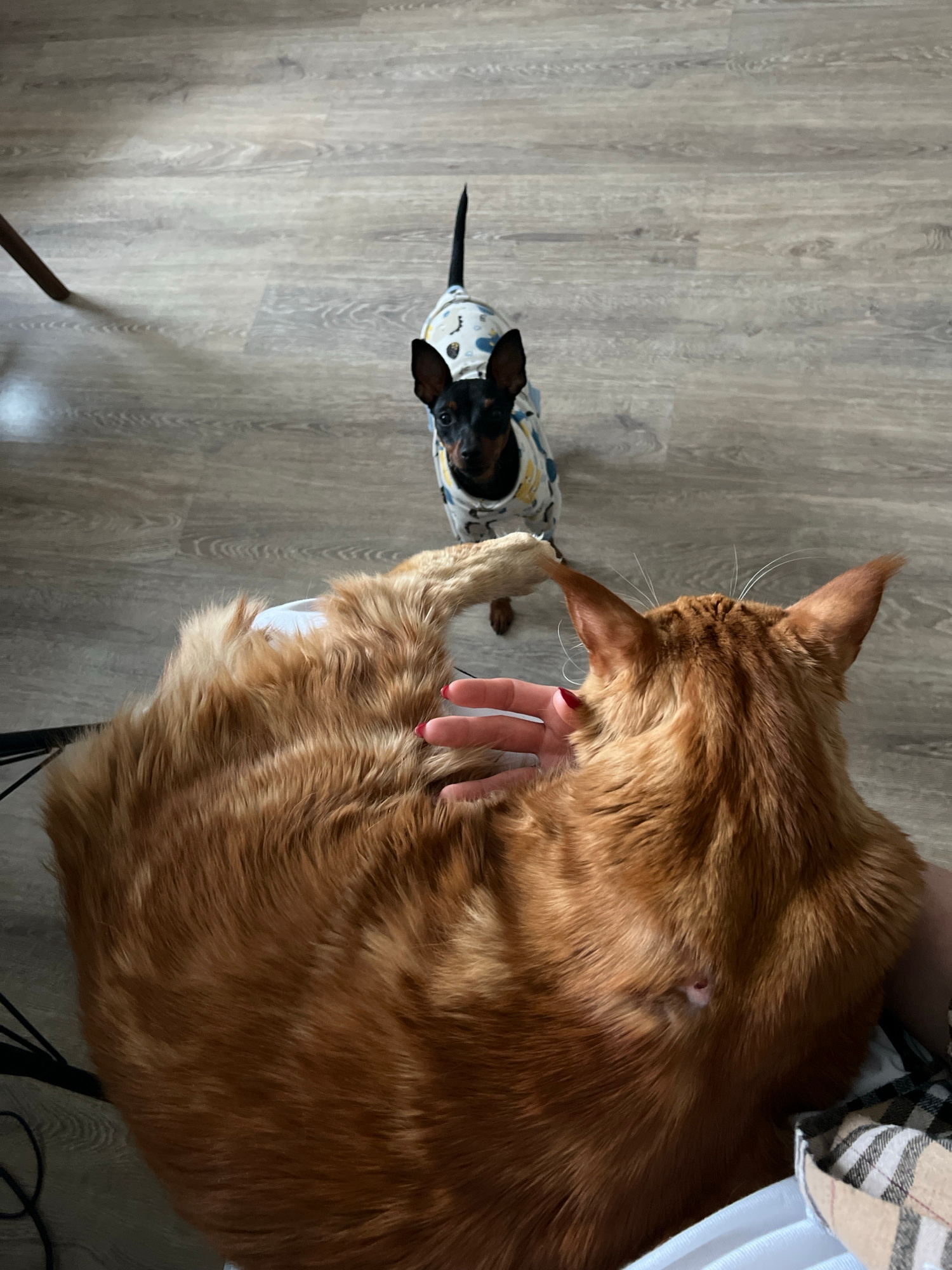 A high-angle shot shows a small, short-haired, black-and-tan dachshund in a patterned shirt looking up at a large, orange cat that is being petted by a hand with red nail polish. The cat's fur is longβ¦read more