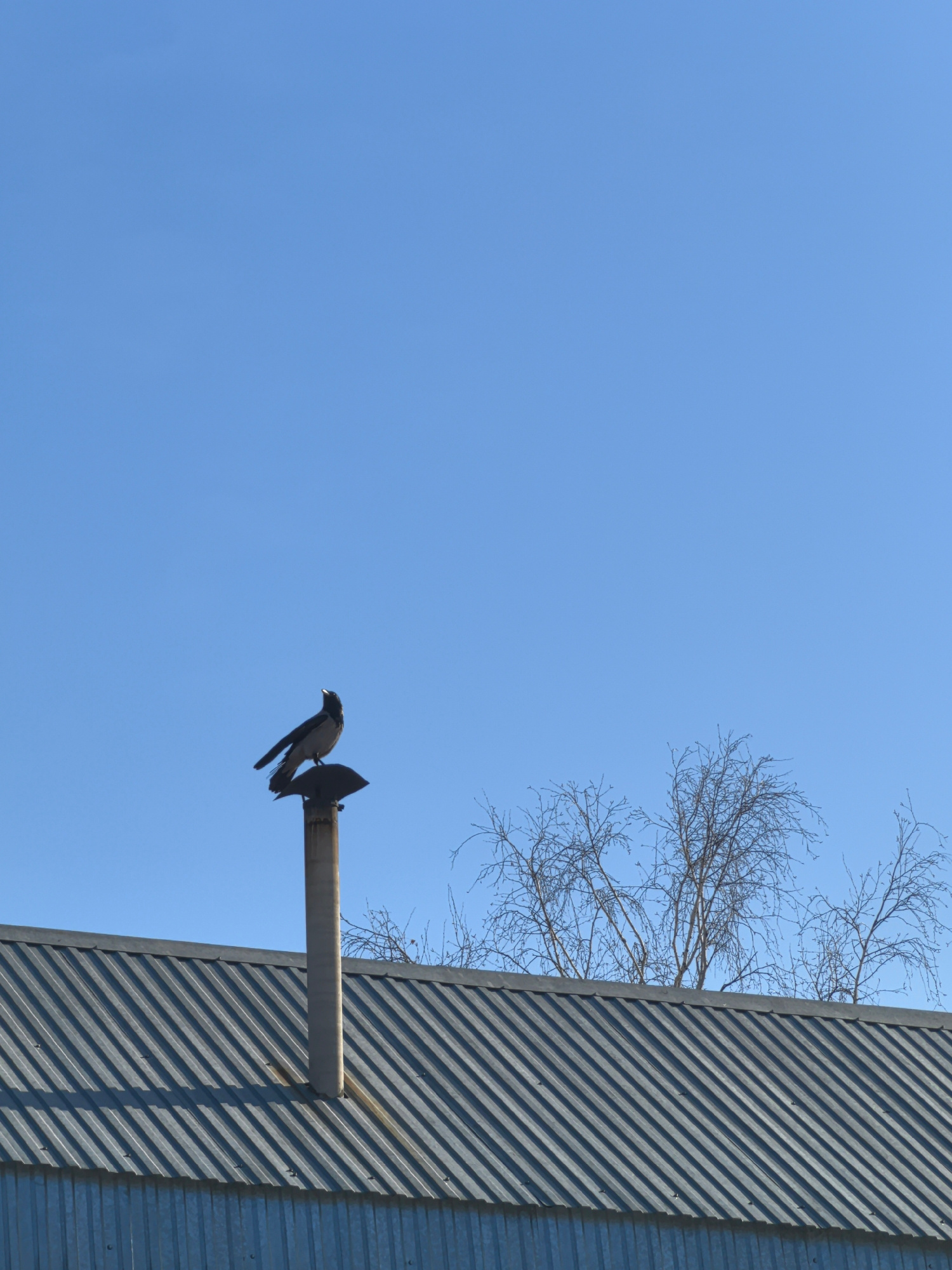 A medium-range shot, under a clear blue sky, reveals a crow perched atop a metal chimney extending from the roof of a low-rise building. The building appears to be covered in corrugated metal siding.…read more