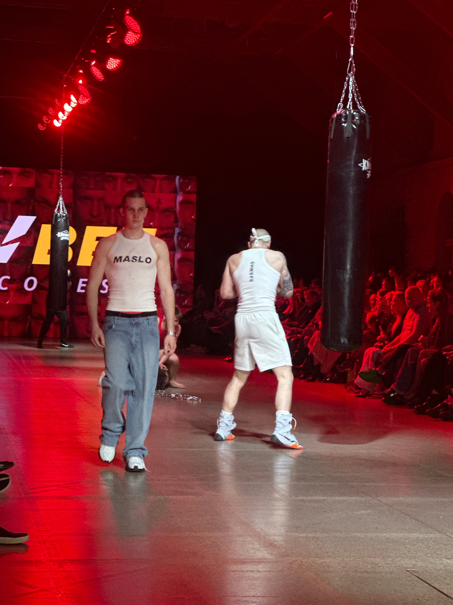 A low-angle, tilted shot reveals a stage setting illuminated by red lighting, possibly a performance or sporting event. Two men are the central figures. One man is wearing jeans, a white tank top withβ¦read more