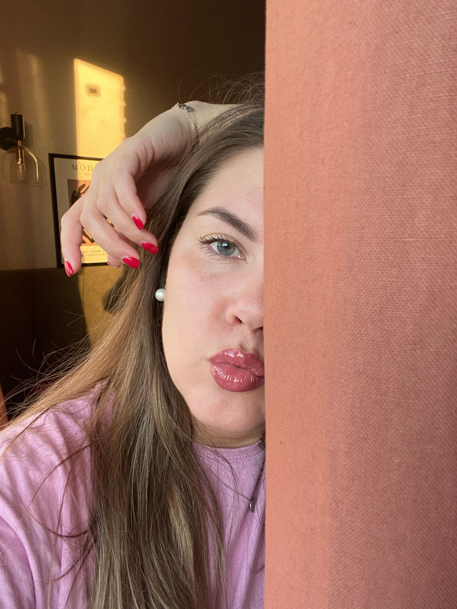 The image is an upside-down selfie of a woman. The upper portion of the frame is obscured by a light peach-colored fabric, possibly a blanket or piece of furniture. Only the lower portion of the woman…read more