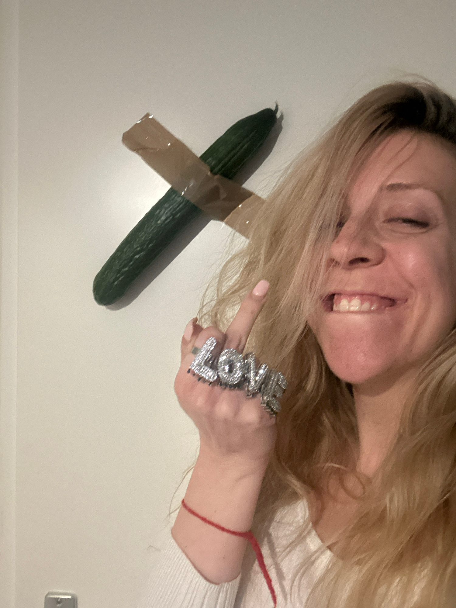 A selfie shows a blonde woman smiling at the camera. Her head is positioned at the top right. She is wearing a large "LOVE" ring and a red bracelet. Her left hand is visible. A cucumber is taped to a…read more