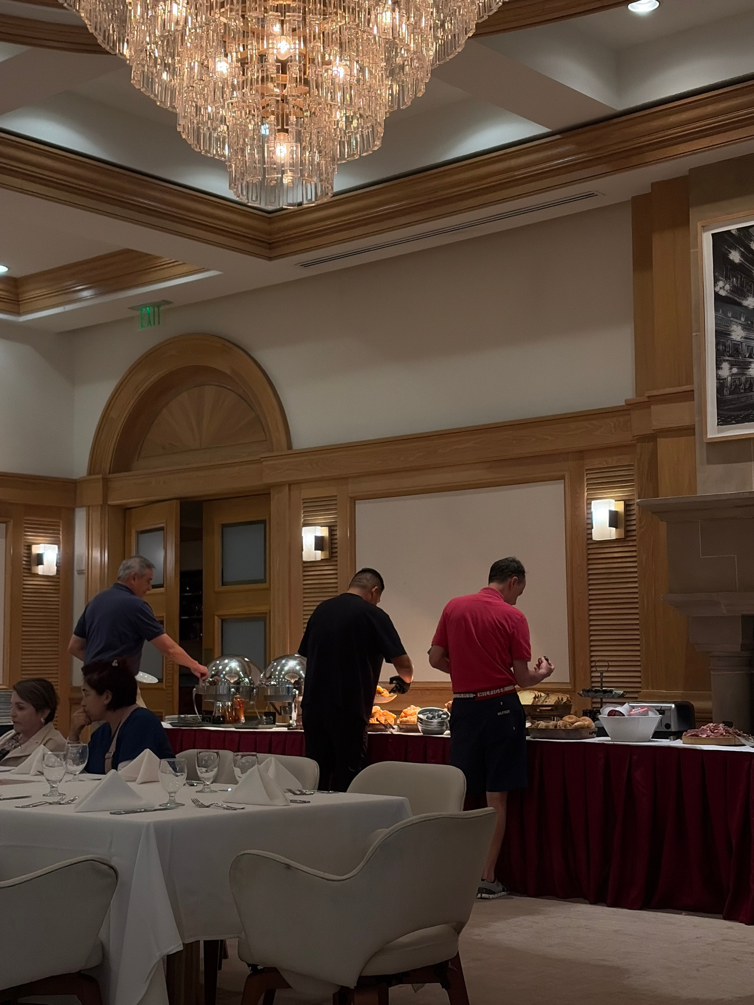 Here is a detailed description of the image: **Scene:** The image depicts a scene in what appears to be a banquet hall or large dining room. The opulent décor includes a large chandelier, wooden paneling, and arched architectural elements. The room is well-lit. **People:** Several individuals are present. Two men are standing near a food buffet, where one is serving himself. There are a couple more people on the right who are having their food. **Objects:** Key objects include a buffet table laden with food, a red tablecloth, serving dishes, silverware, and glassware set on a white tablecloth on the table in the foreground. The tables are set up for a formal dining event, with white chairs. **Actions:** People are engaged in the act of serving themselves from the buffet, interacting with food items, and sitting down to eat. **Interactions:** The people are interacting with the food at the buffet. There are people seated at the table, presumably to dine. **Environment:** The hall exudes a formal, elegant atmosphere, suggesting a special event or celebration. **Location in Key Biscayne:** The location of this image in Key Biscayne can not be determined solely on this image. | Open Wire