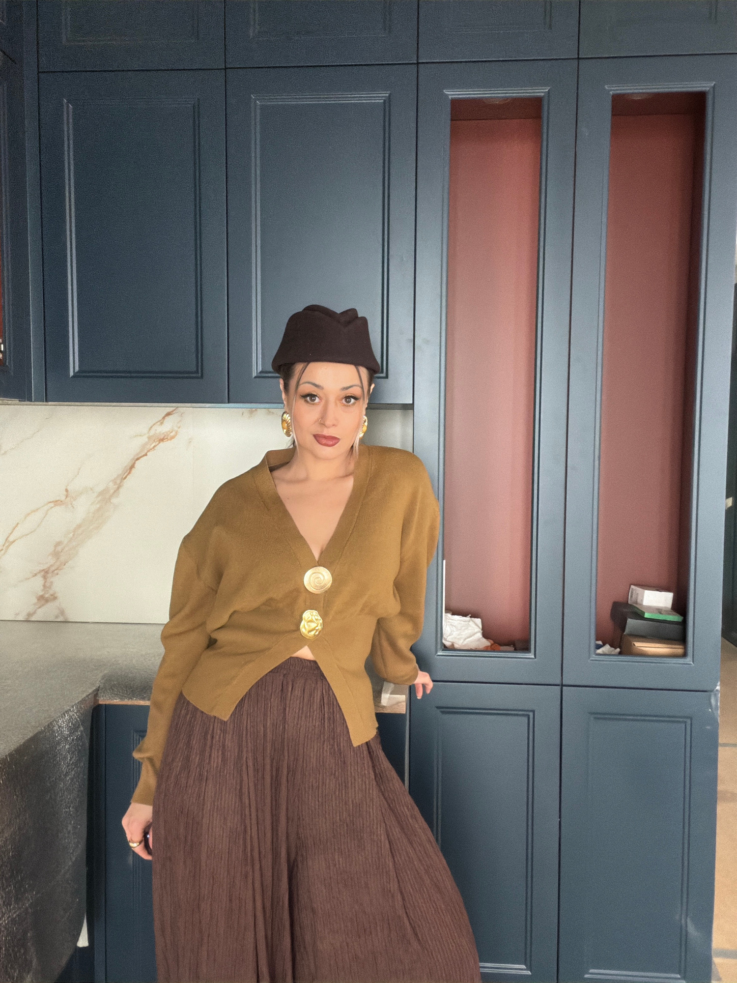 The image displays a young adult woman standing indoors, posing for a photograph. The woman has dark hair, partially covered by a dark brown beret. She wears striking large, gold-toned earrings and da…read more