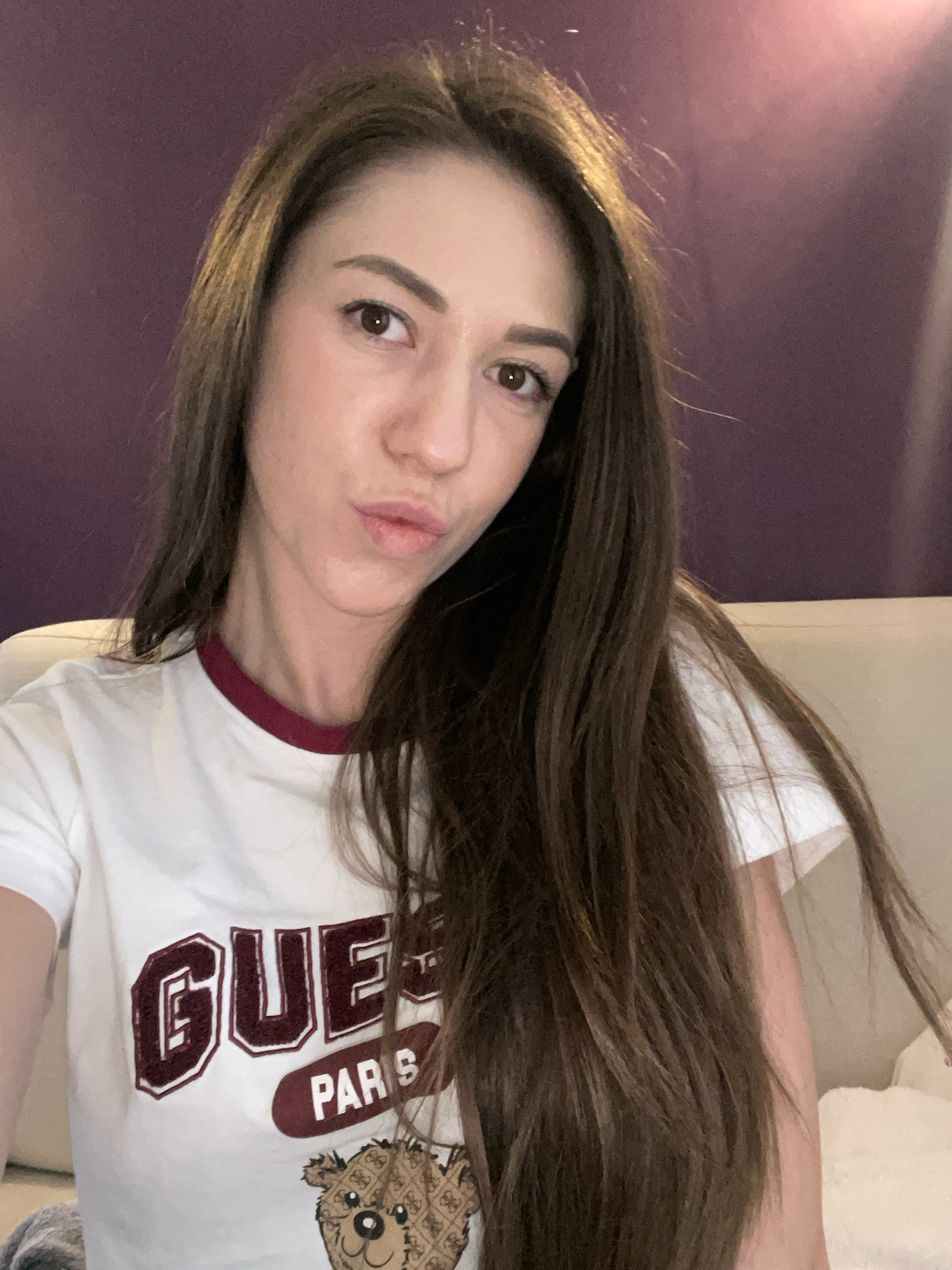 A woman takes a close-up selfie, captured at a slight angle with her head tilted to the right. She has long, dark brown hair with lighter brown highlights, which flows across the frame. Her face is tu…read more