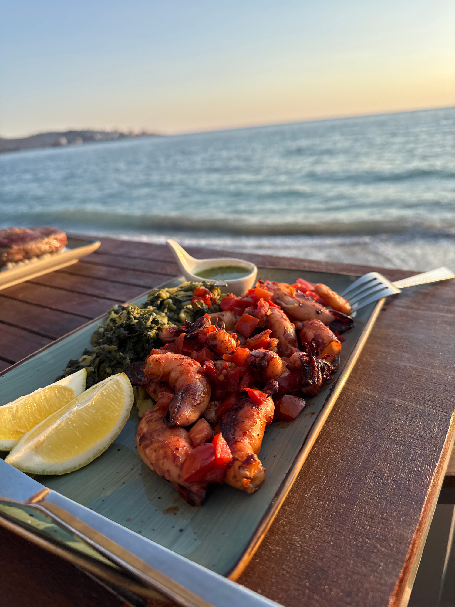 The image captures a plate of grilled octopus salad, likely in a restaurant or outdoor dining area near the sea in Bar, Montenegro. The plate is on a wooden surface, presumably a table. The main subj…read more