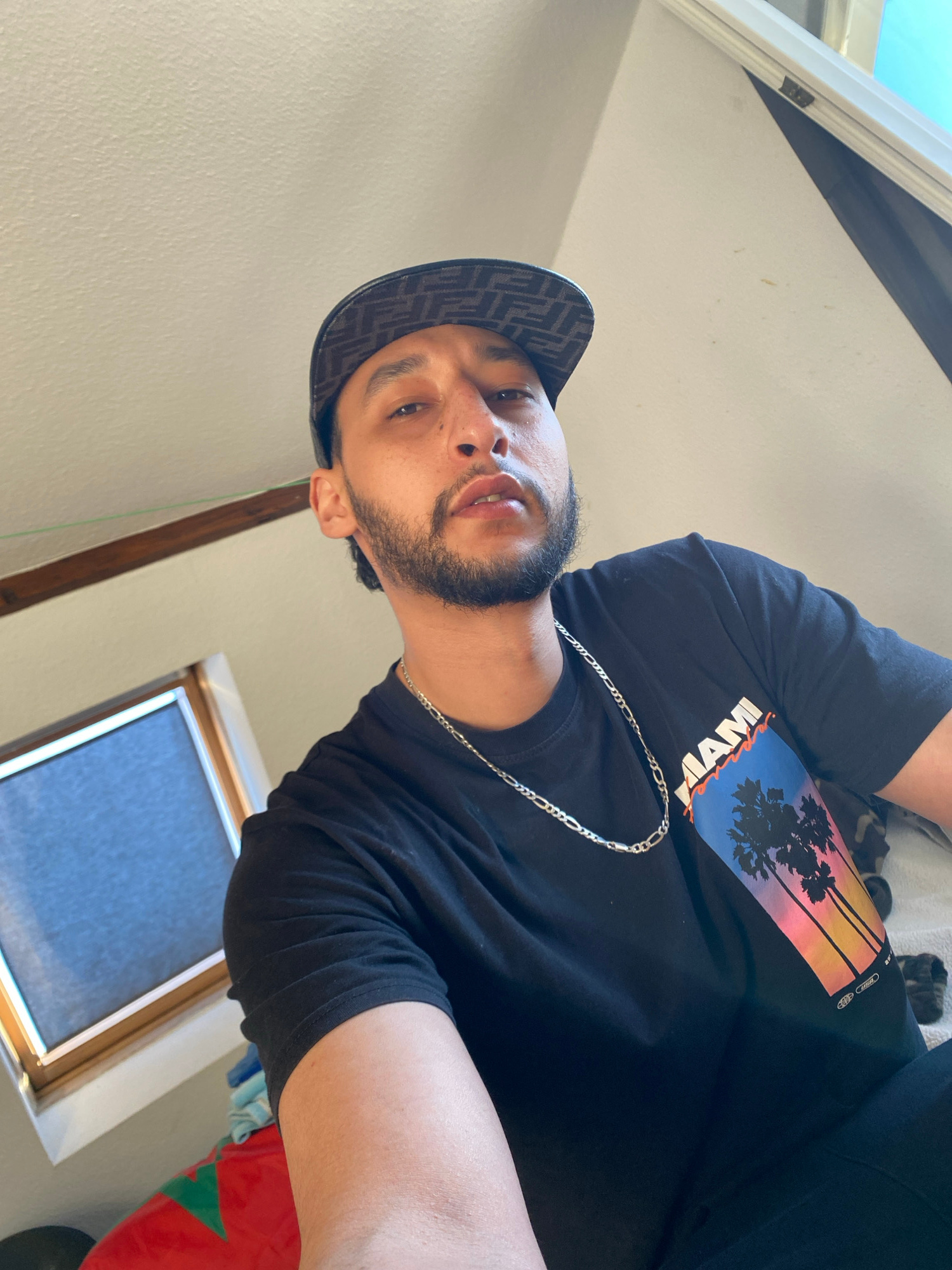 A man with a trimmed beard and a Fendi patterned baseball cap is wearing a black long-sleeved shirt with a "Miami" themed design featuring palm trees. A silver chain is visible around his neck. The im…read more