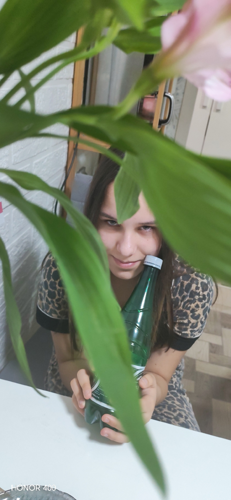 A young woman, partially obscured by green leafy plants, is holding a green water bottle. She has long brown hair and is wearing a leopard-print top. The scene appears to be indoors. A white brick wal…read more
