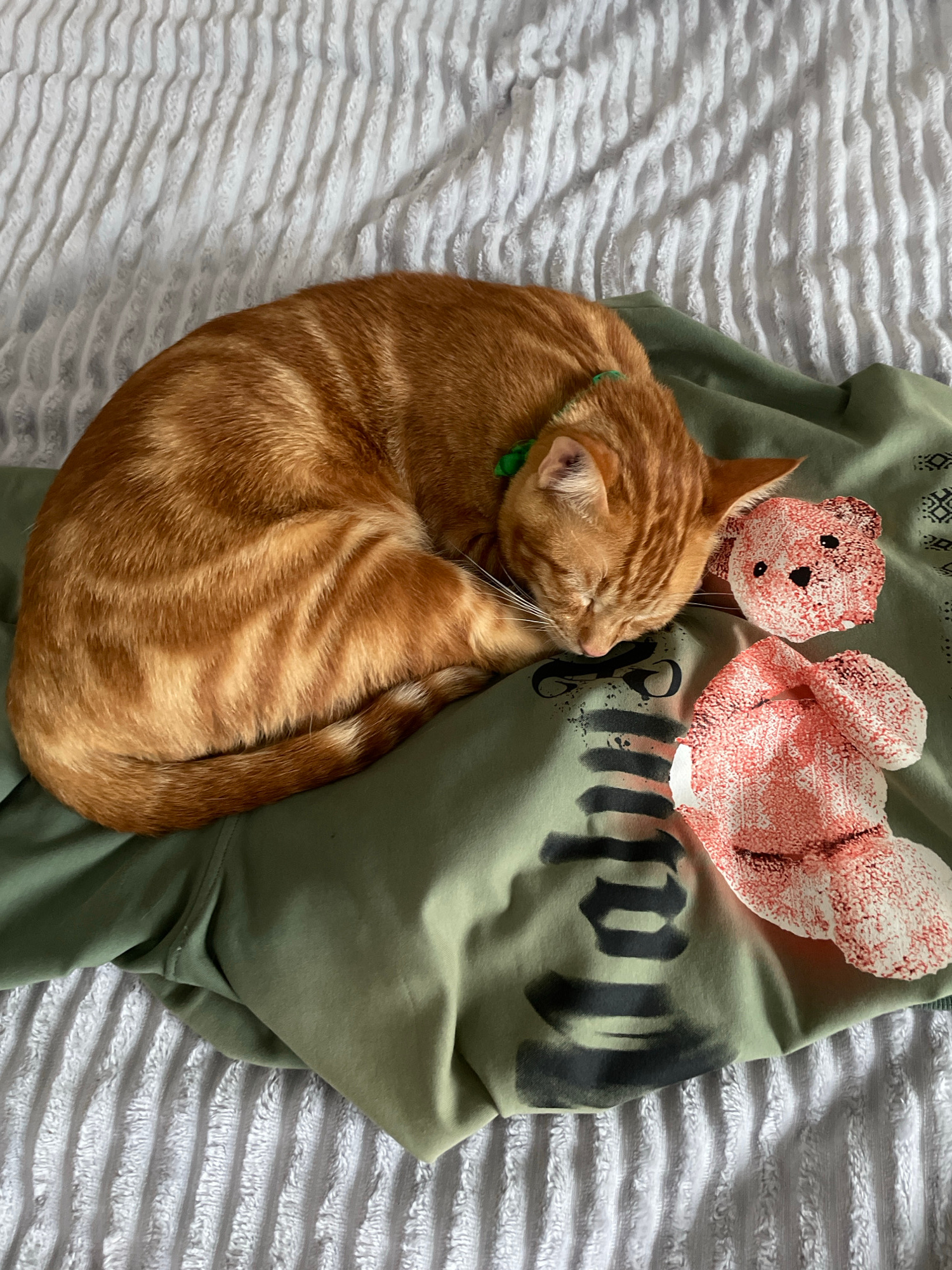 An orange tabby cat is captured sleeping soundly, curled into a tight ball on a green sweatshirt. The cat's fur displays vibrant ginger and orange hues with clear tabby markings, and it wears a small,…read more