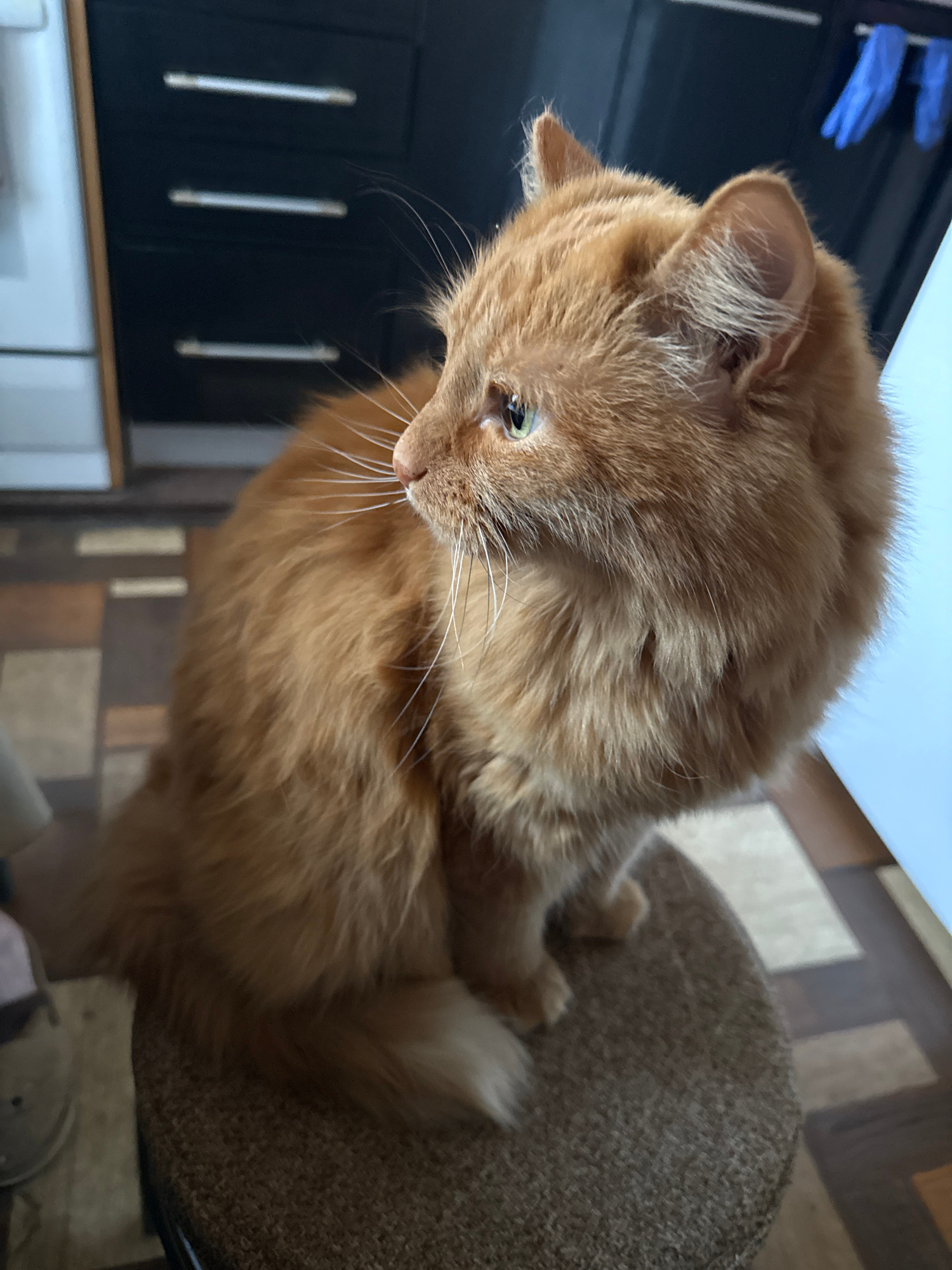 A reddish-orange cat is perched on a tweed chair, its head angled downwards. The cat appears to be indoors, near a dark cabinet with vertical grooves and a light-colored countertop. The floor has a ti…read more