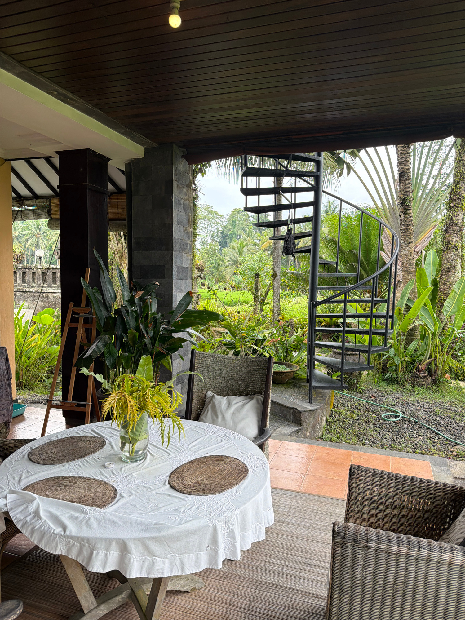 This image captures a serene outdoor patio or balcony area, likely part of a dwelling or resort, overlooking a lush tropical landscape in Tegallalang, Indonesia. In the foreground, a round wooden tabl…read more