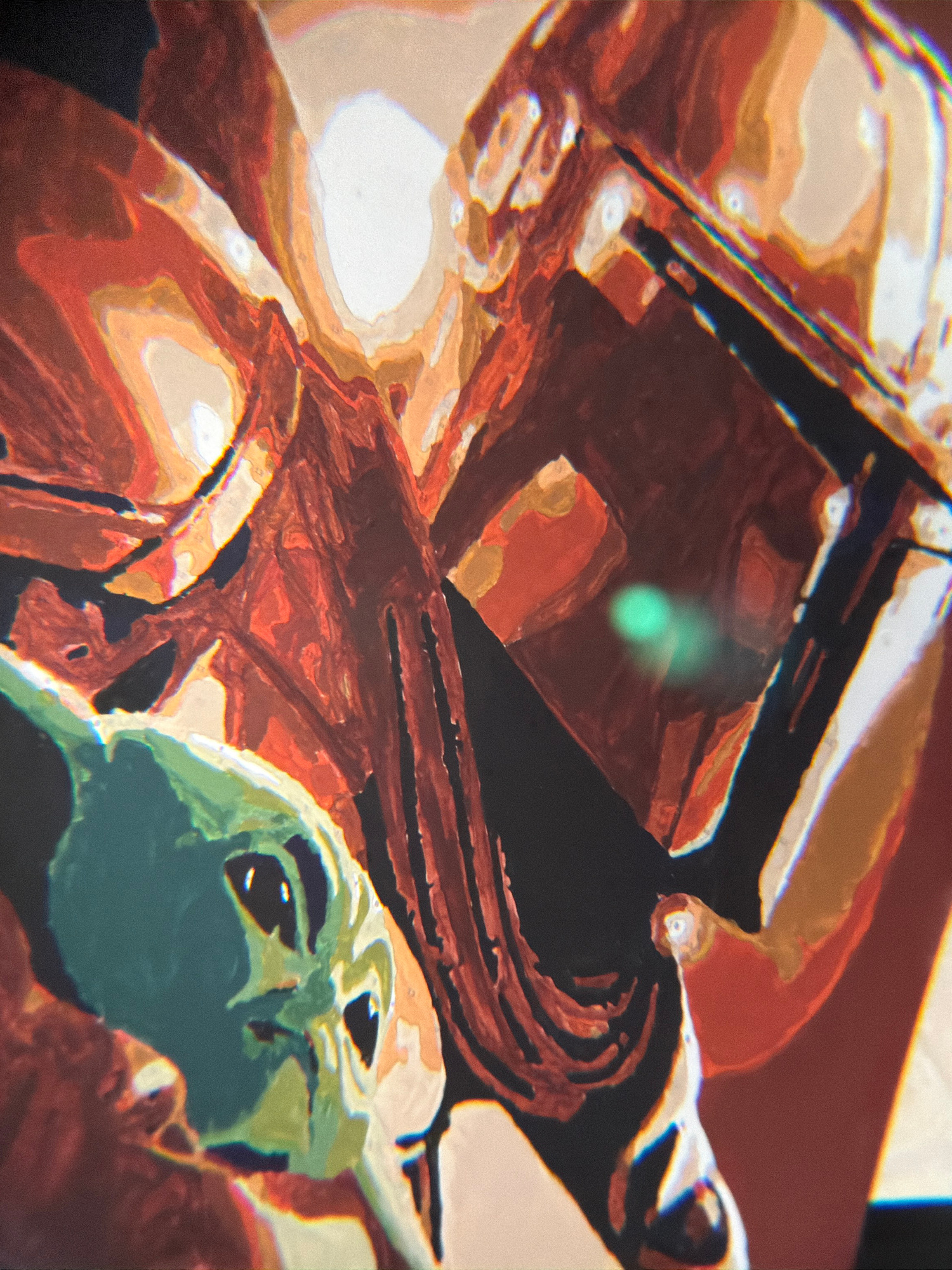 The image is a close-up shot of an illustration depicting The Mandalorian and Grogu (Baby Yoda). The Mandalorian's helmet is in the upper left portion of the image, rendered in tan and orange tones. G…read more
