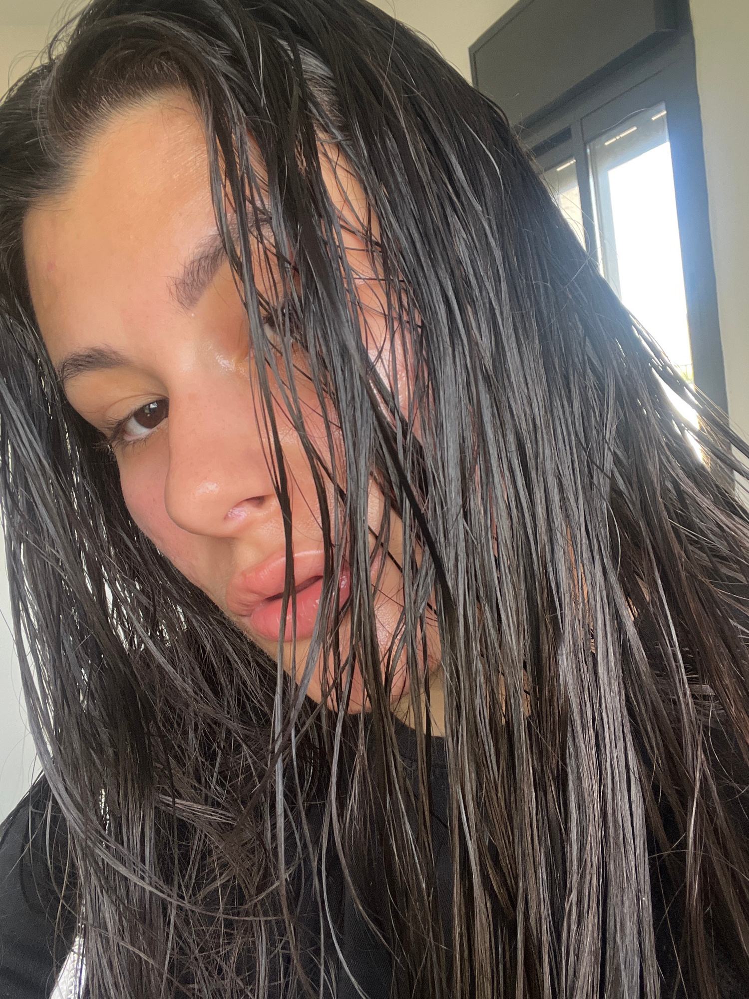A close-up, rotated image shows a person with wet, dark brown hair partially obscuring their face. The person has light skin, dark eyebrows, and visible facial features including an eye looking left,…read more