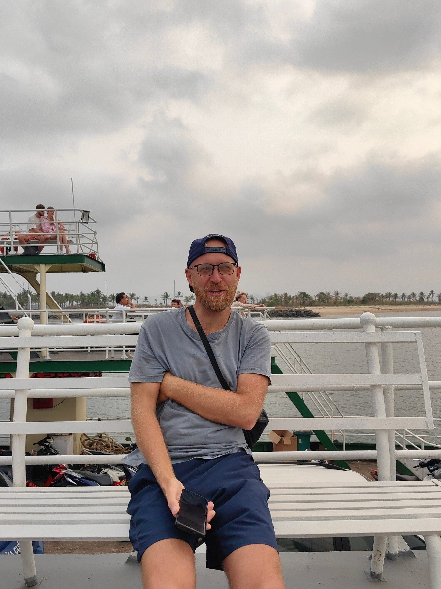 The image shows a man seated on a bench on a ferry. He is wearing a grey t-shirt, blue shorts, and a blue baseball cap. He has a beard and is wearing glasses. He is holding a black smartphone in his l…read more