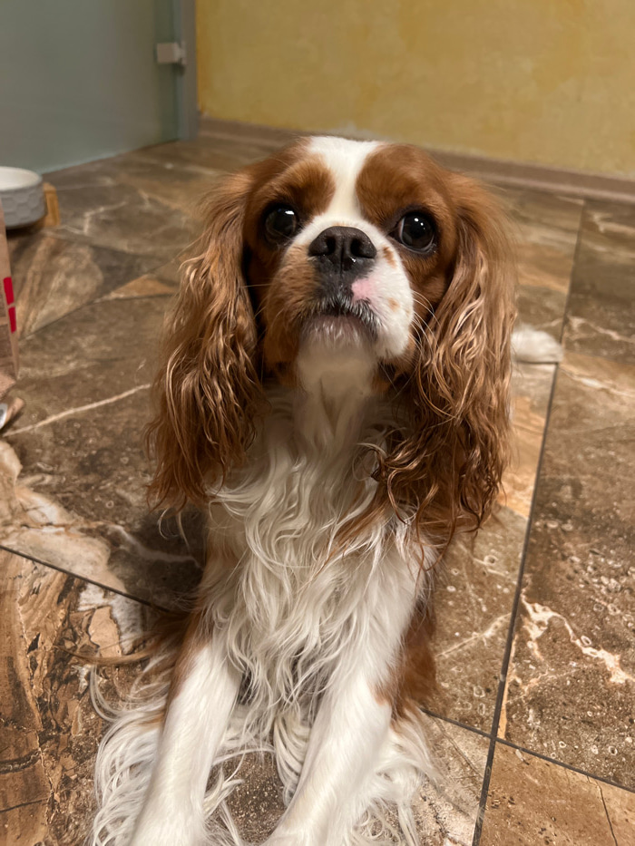 A Cavalier King Charles Spaniel lies on a tile floor with tan and brown marbling. The dog's head is cocked to the side, with brown and white markings on its face, and large, dark eyes. The dog has lon…read more