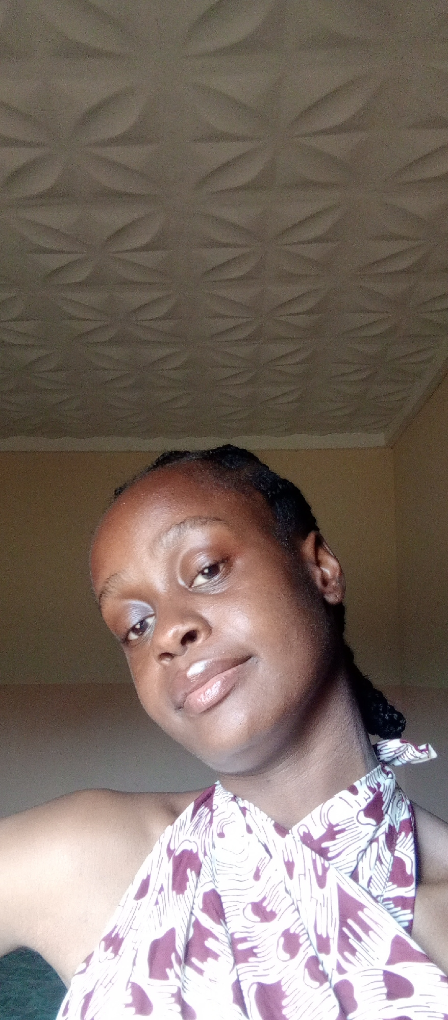 A close-up portrait features a young Black woman looking directly at the camera with a gentle, slight smile. Her head is tilted slightly to her right. She has dark skin with a natural sheen, braided h…read more