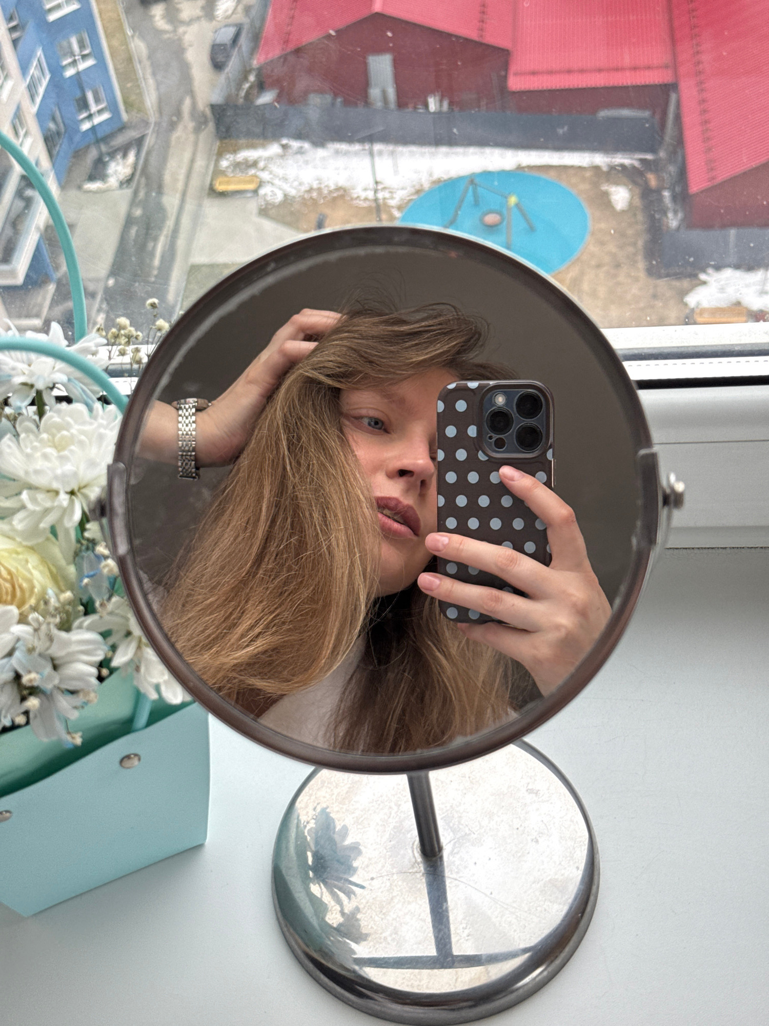 The image shows a person reflected in a circular mirror taking a selfie with a smartphone. The person has long, light brown hair partially covering their face, a silver watch is visible on their wrist…read more