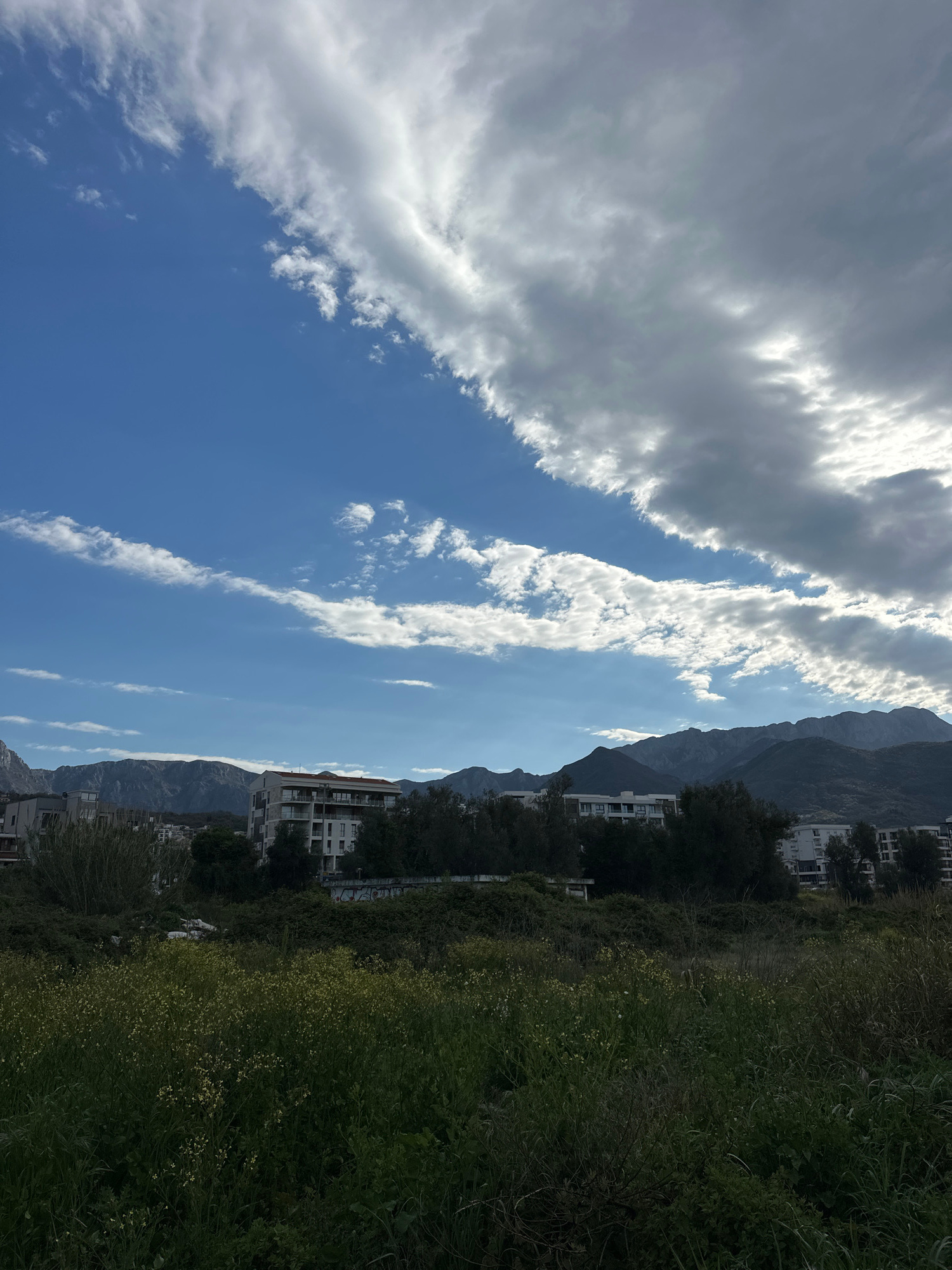 The image shows a landscape with a view of a mountain range and a partly cloudy sky in Šušanj, Montenegro. White buildings are visible on the lower slopes of the mountains. The foreground features veg…read more