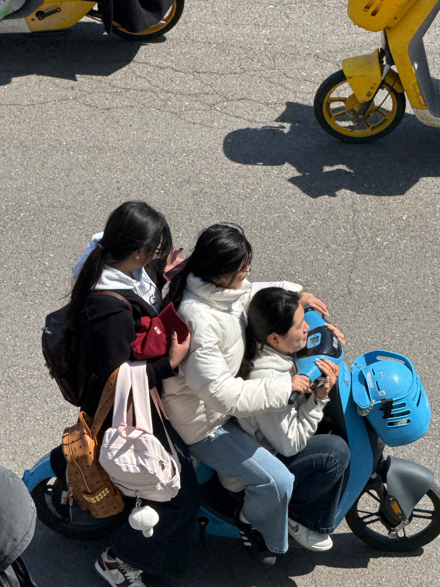 The image, taken from an elevated perspective, depicts three individuals interacting with two blue electric scooters and a yellow electric scooter on a gray asphalt surface, possibly in Zhongtun, Chin…read more