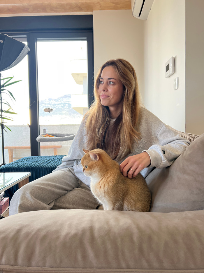 An adult female and a golden-orange cat are positioned on a light brown sectional sofa within an indoor living space, likely an apartment in Bar, Montenegro. The female, with long, wavy, light brown h…read more