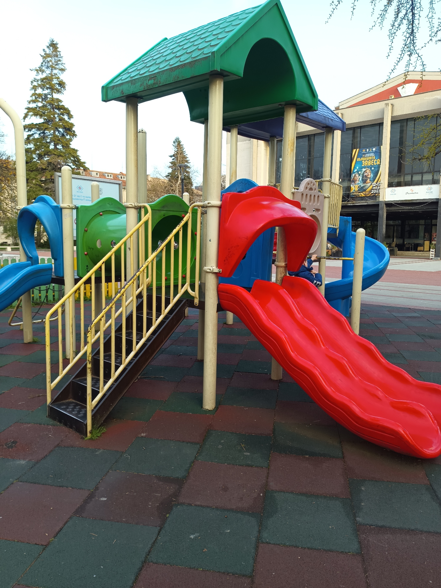 The image shows a playground structure with a green roof, yellow stairs, and a red slide. The structure also features blue and green tunnel elements. The playground is situated on a surface of green a…read more