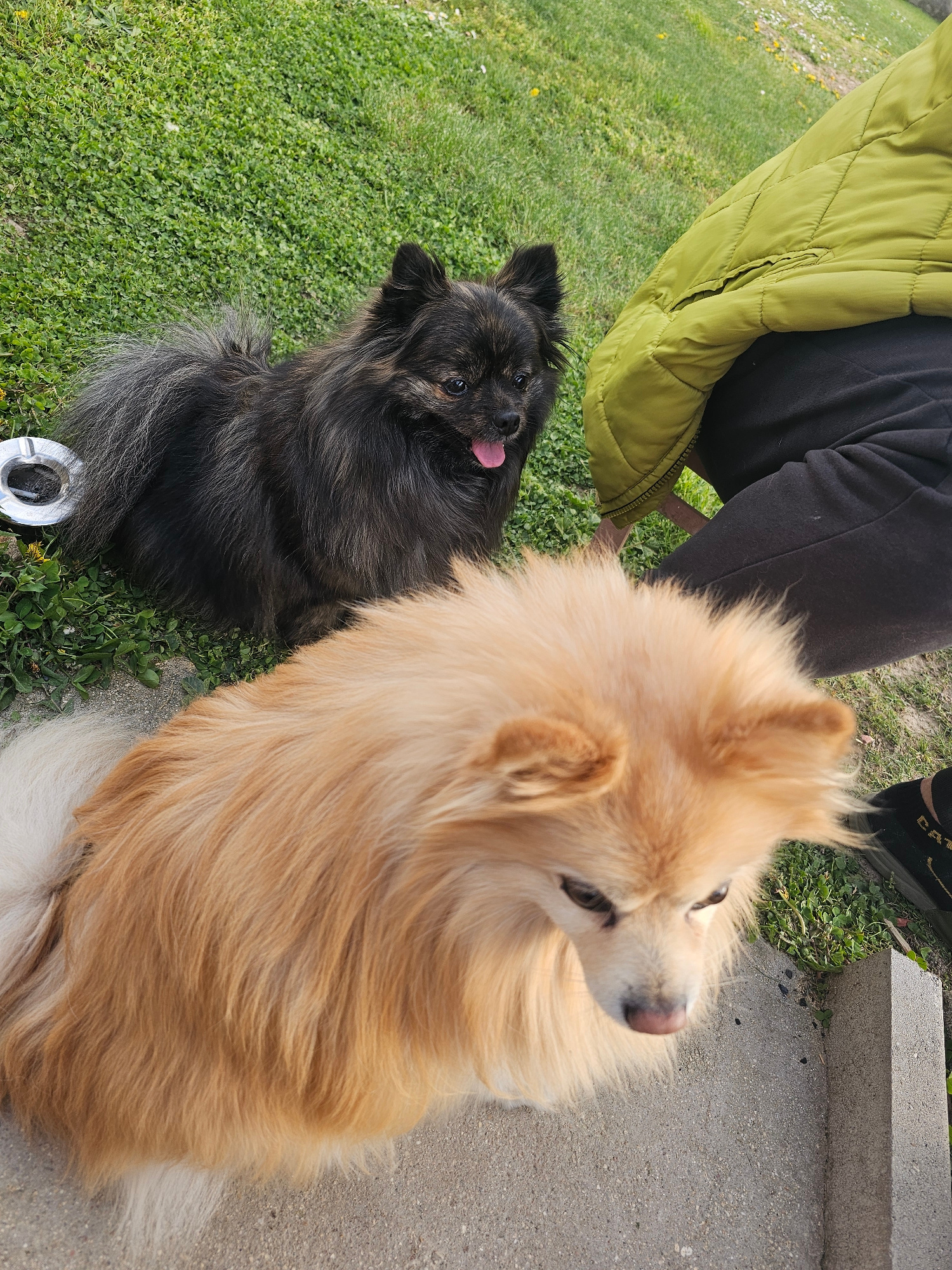 Two dogs, one black and one tan/gold, are sitting on the ground. The black dog is on grass, sticking its tongue out, and has a metal object next to it. The tan/gold dog is partially on grass and partiβ¦read more