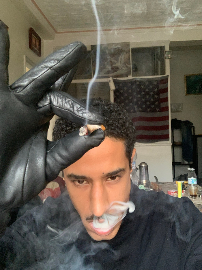 A person with curly hair and brown eyes wears a black sweatshirt and black leather gloves while smoking. The cigarette is held between the gloved fingers. Smoke curls out from their mouth. An Americanβ¦read more