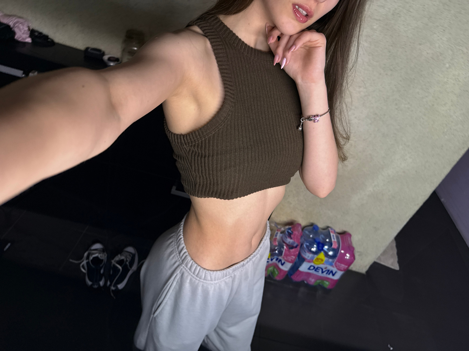 The image depicts a woman in a brown tank top and grey sweatpants, positioned at an oblique angle to the camera. She is indoors, possibly in a room with a light-colored carpet. A six-pack of "Devin" b…read more
