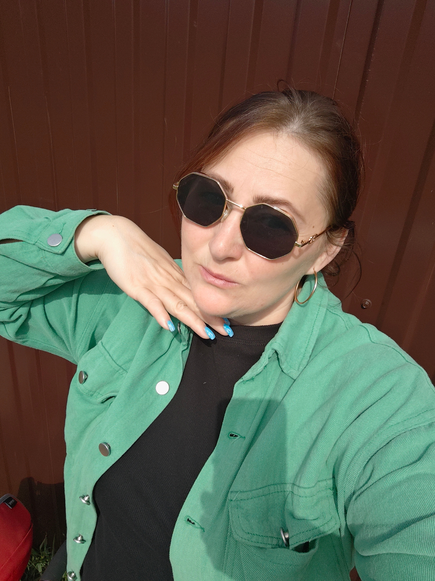 A woman poses for a portrait outdoors in Марковский, Russia, against a backdrop of a tall, dark brown corrugated metal fence. The scene is illuminated by bright, sunny daylight, creating clear highlig…read more