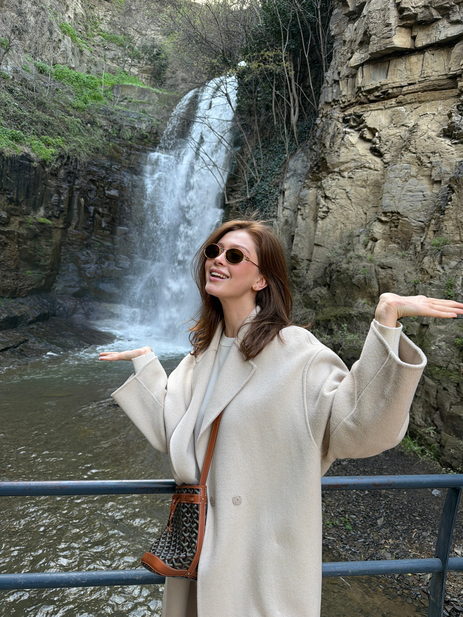 A young woman stands in front of a waterfall in Tbilisi, Georgia. She wears a beige coat, round sunglasses, and a brown shoulder bag. Her left arm is raised. She is standing on a metal platform. The w…read more