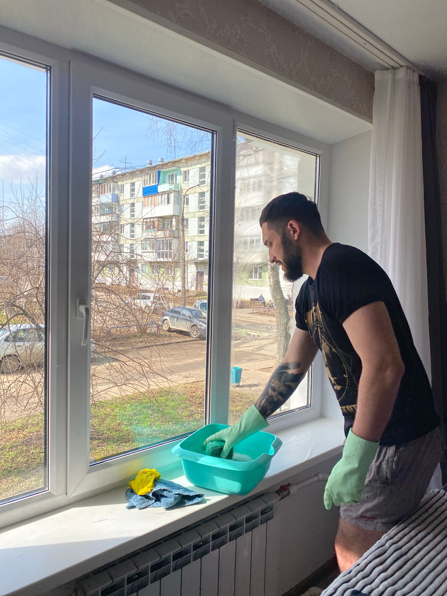 A man is cleaning a window in a building located in Chaikovsky, Russia. The man is wearing a black t-shirt, grey shorts, and green gloves. He is holding a green bucket and a sponge, and he is wiping t…read more