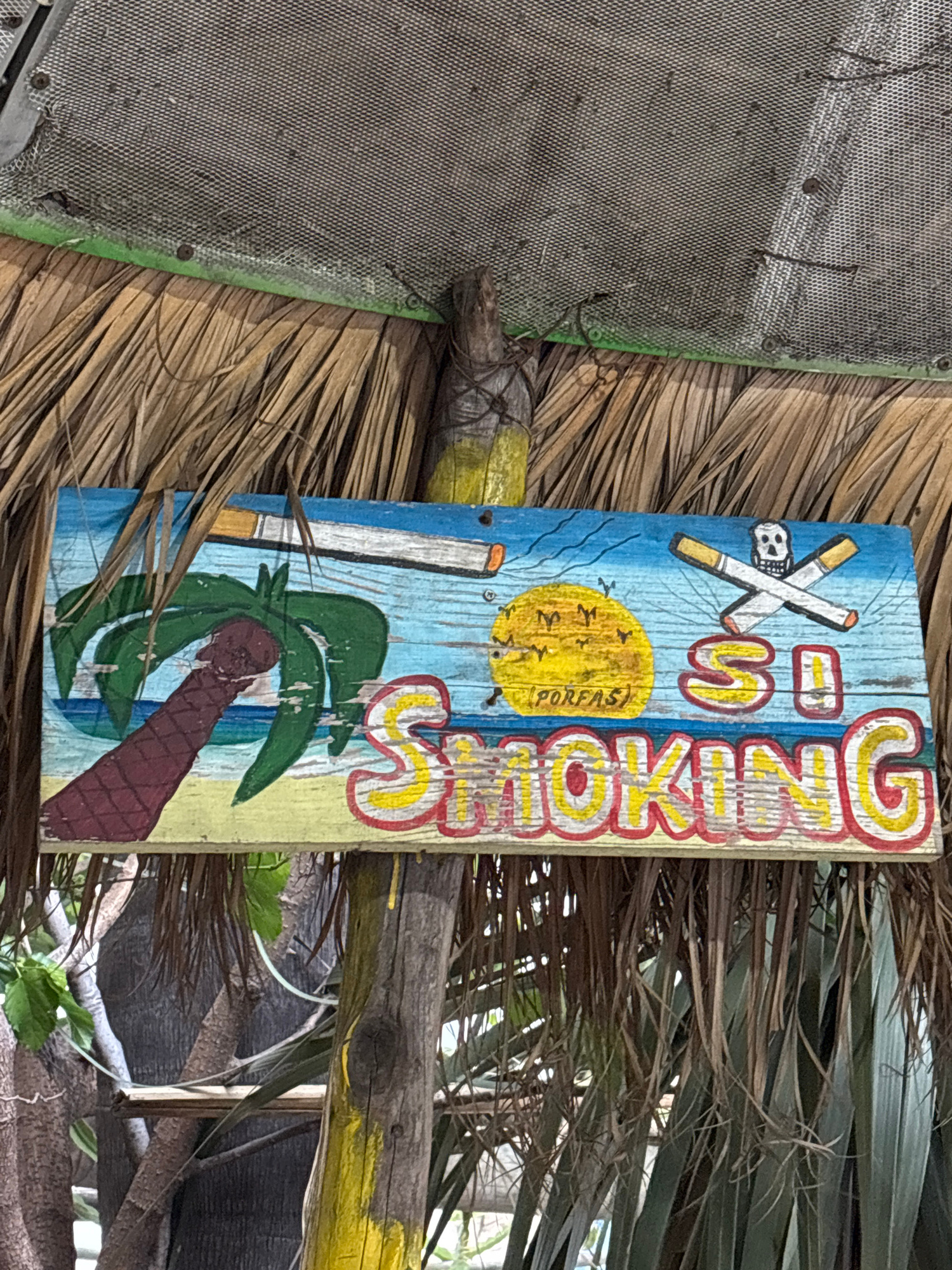 The image shows a handmade, painted sign with the words "Smoking Is PORFAS" stacked vertically, accompanied by a skull-and-crossbones cigarette graphic, a yellow sun with birds, and a rudimentary palmβ¦read more