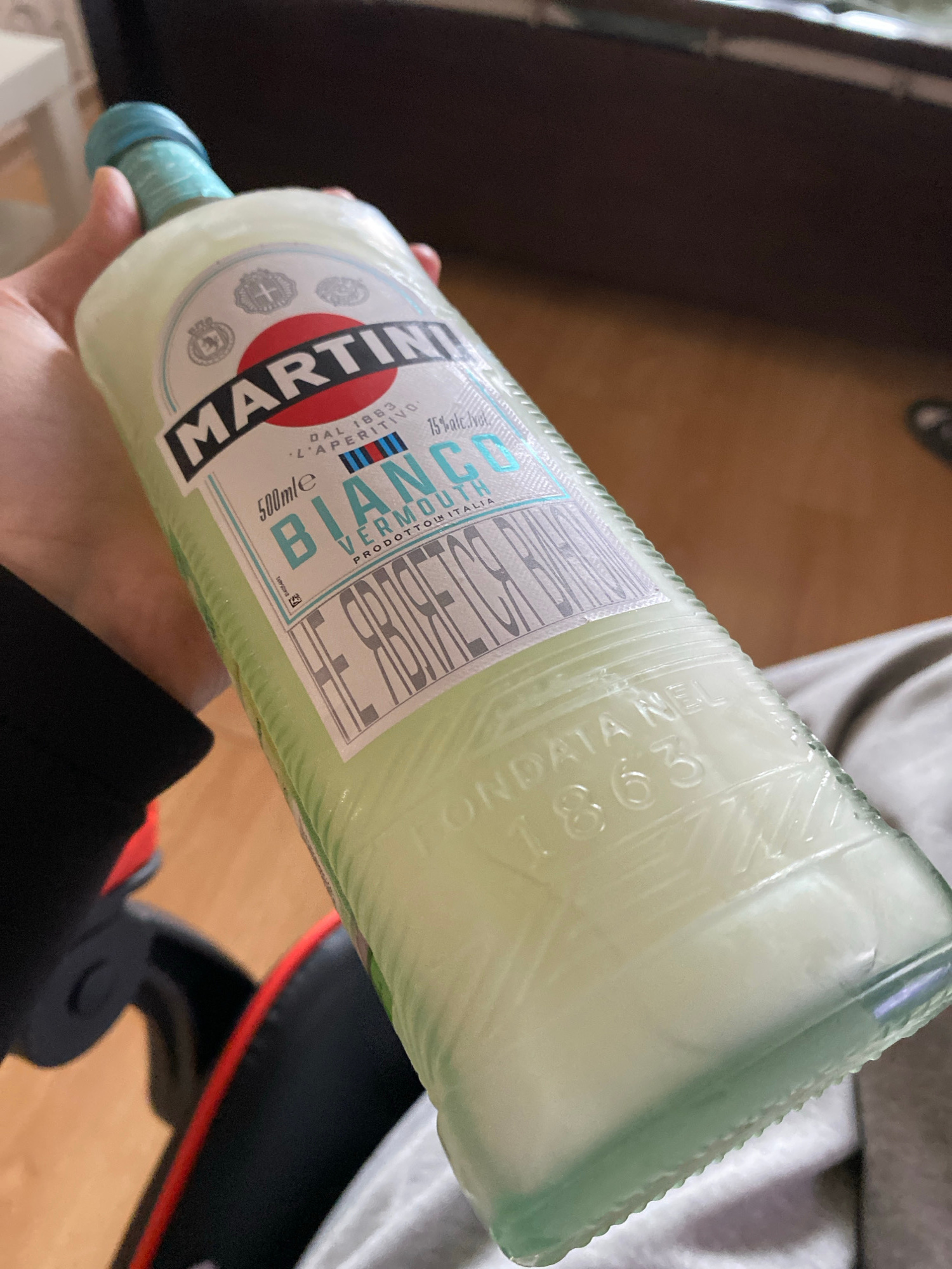 A person is holding a bottle of Martini Bianco vermouth. The bottle is green glass and appears to be partially full with a pale, yellowish liquid. The label on the bottle indicates "MARTINI" in bold l…read more