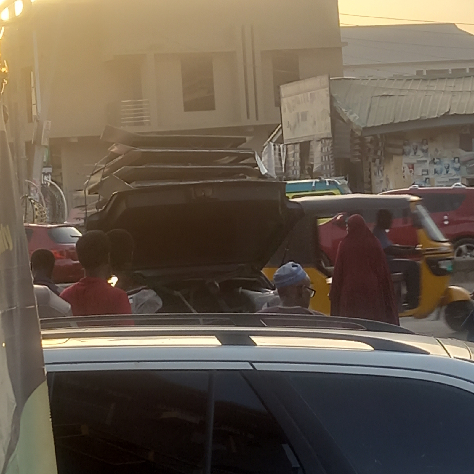A daytime street scene in Dadi Riba, Nigeria, shows a row of parked cars and vans along a street lined with low buildings and shops. People are visible around the vehicles, some appearing to be engage…read more