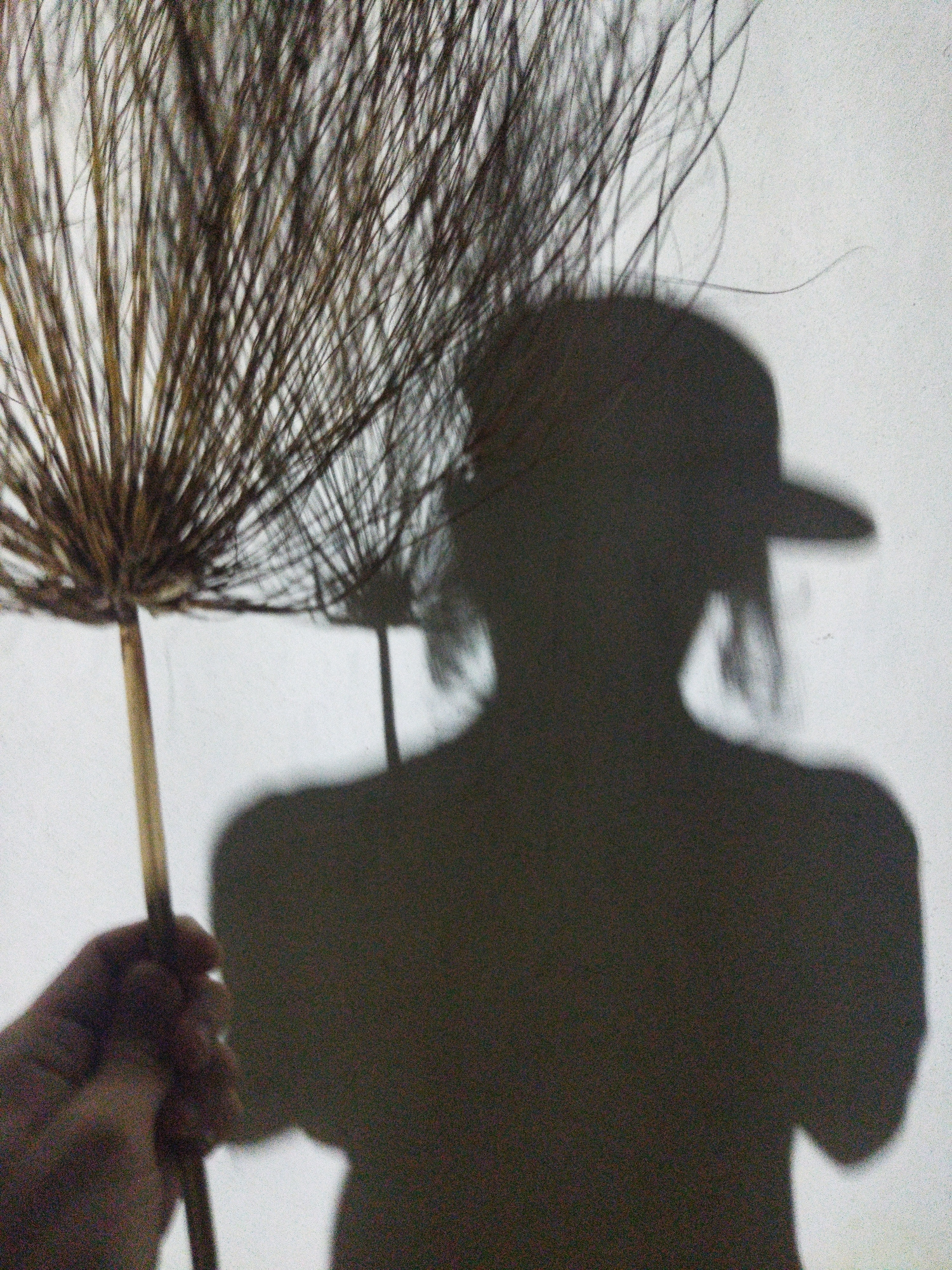 A shadow of a person wearing a cap is cast on a white wall in Tinaquillo, Venezuela. The person is holding a papyrus plant in their left hand. The plant casts a separate, smaller shadow on the wall be…read more