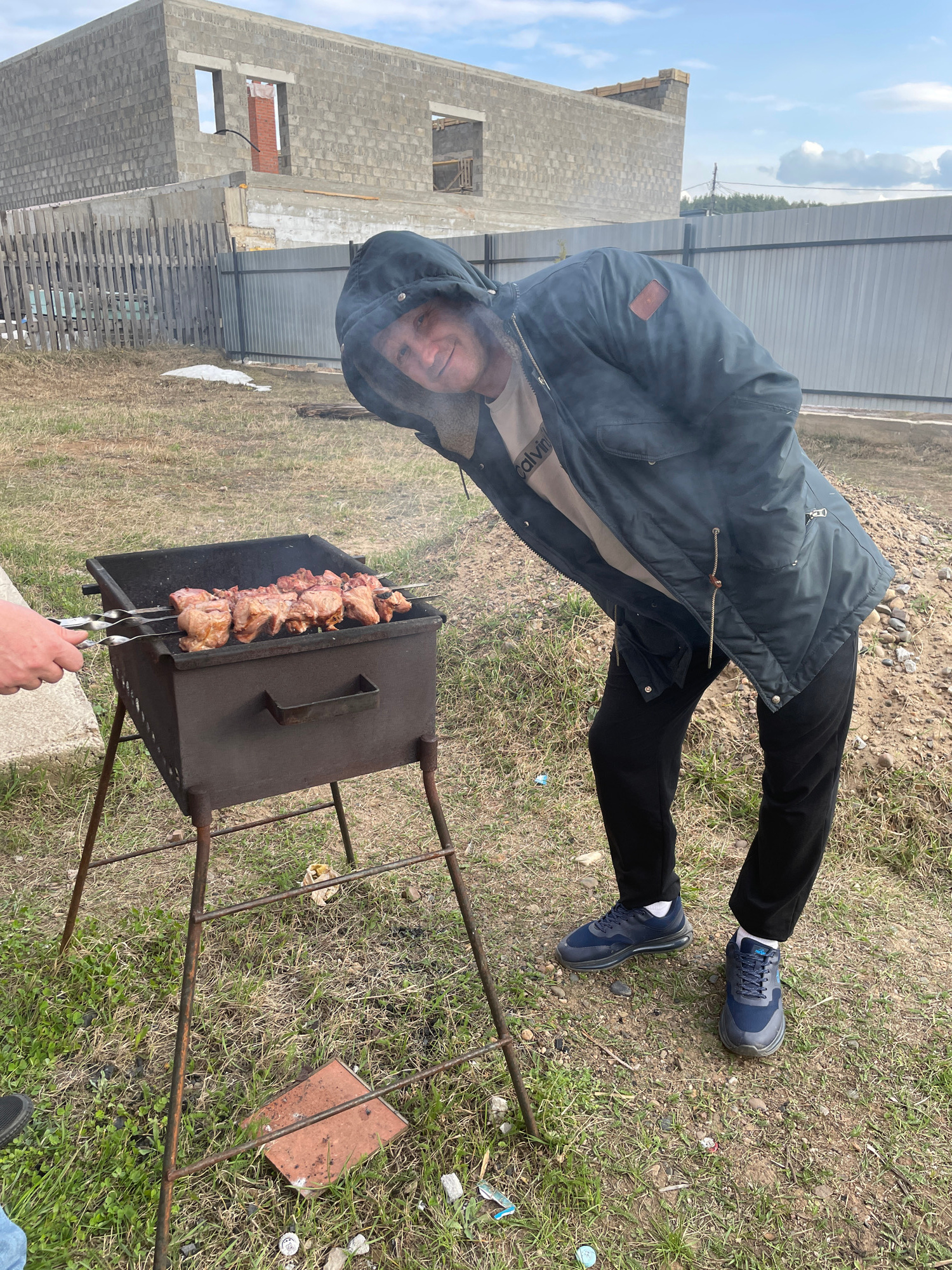 The image shows a person standing next to a barbecue grill with skewers of meat cooking over coals. The person is wearing a dark jacket with the hood up, black pants, and blue sneakers. Smoke is risin…read more