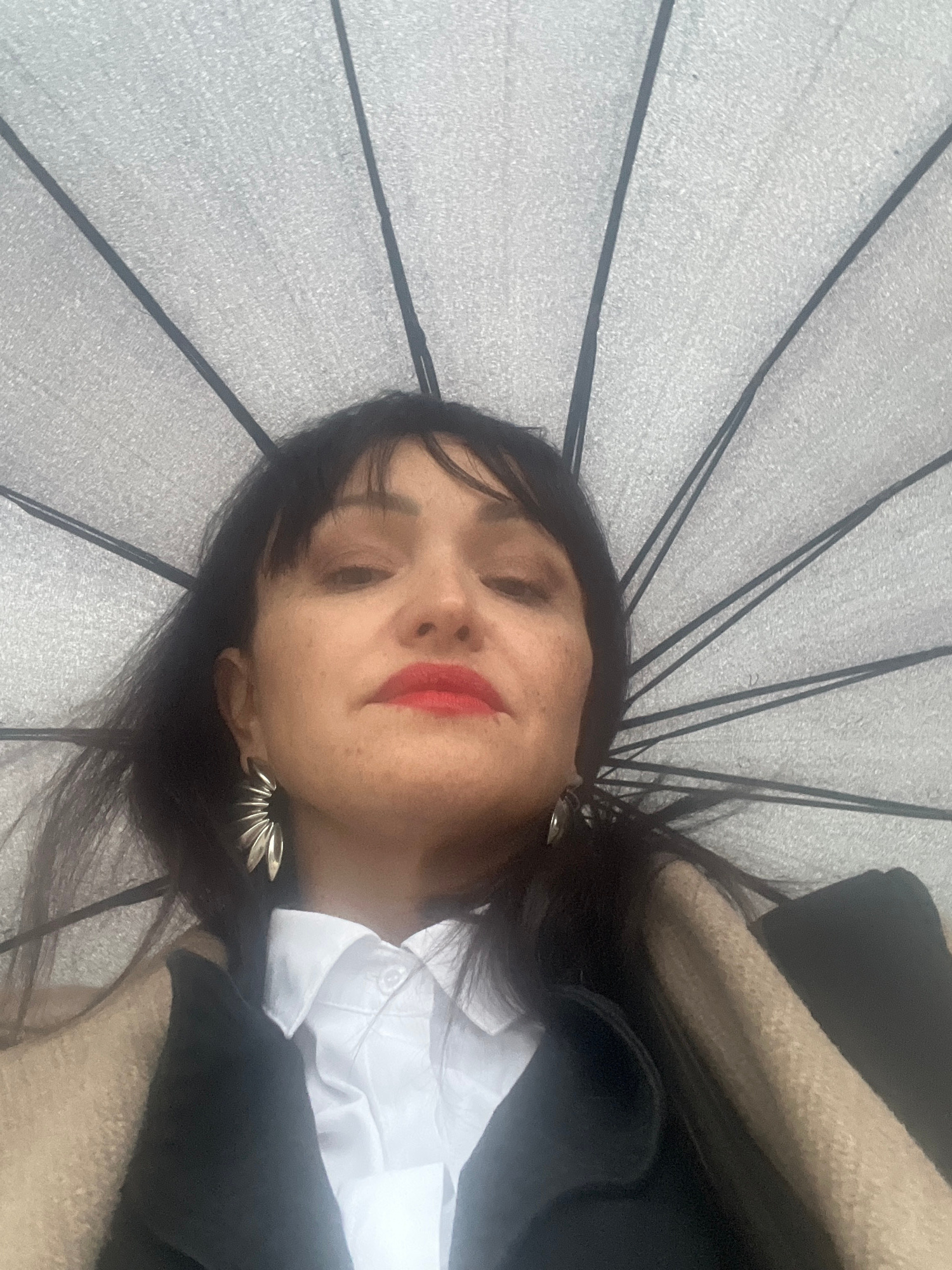 A woman with dark hair and red lipstick lies under an open umbrella. She wears a white shirt under a dark jacket, and earrings with a concentric fan design. The umbrella has a light-colored fabric andβ¦read more