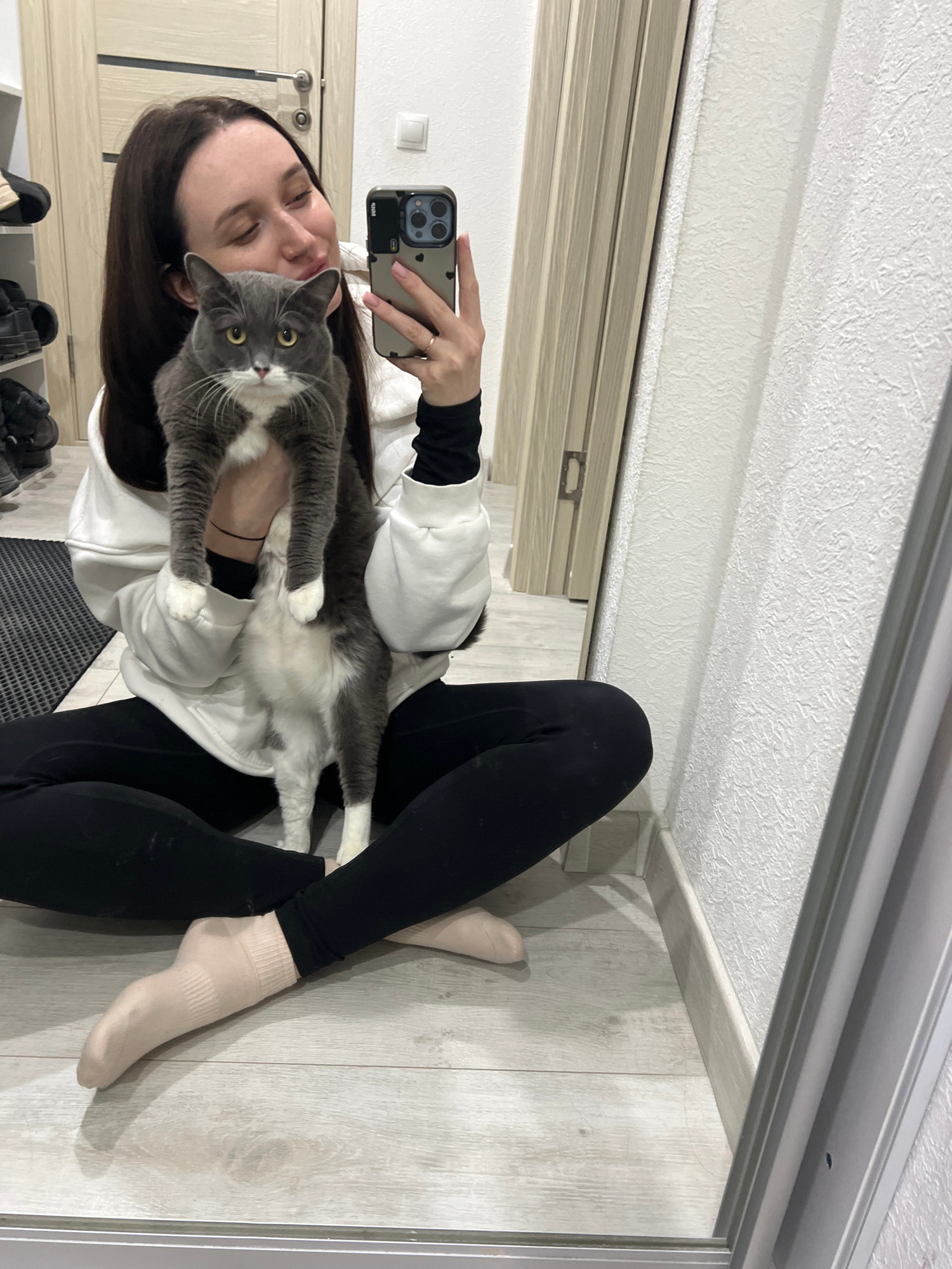 A woman sits on a light-colored wooden floor wearing black leggings and tan socks. She is wearing a white hoodie with a black long-sleeved shirt underneath. She holds a gray and white cat in her arms…read more