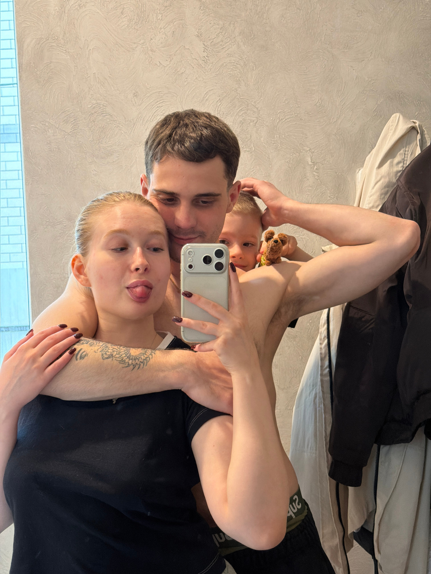 A selfie captures a man, a woman, and a child. The man, with short dark hair, looks toward the camera with his eyes open. The woman, positioned below the man, is fair-skinned with blonde hair, stickin…read more