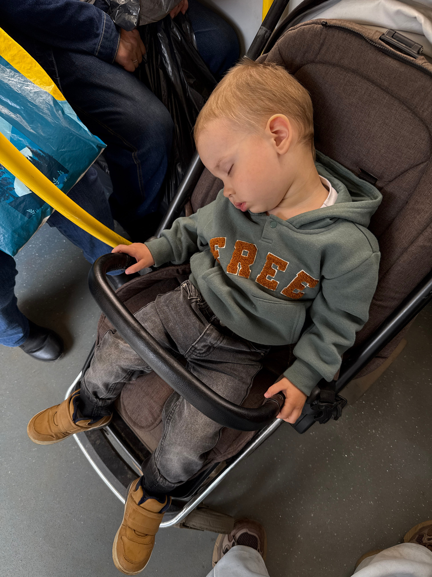 This overhead shot captures a young child soundly asleep in a dark brown stroller, likely within a public transport vehicle in Rusanovo, Russia. The child, with light blonde hair, is lying on their ba…read more