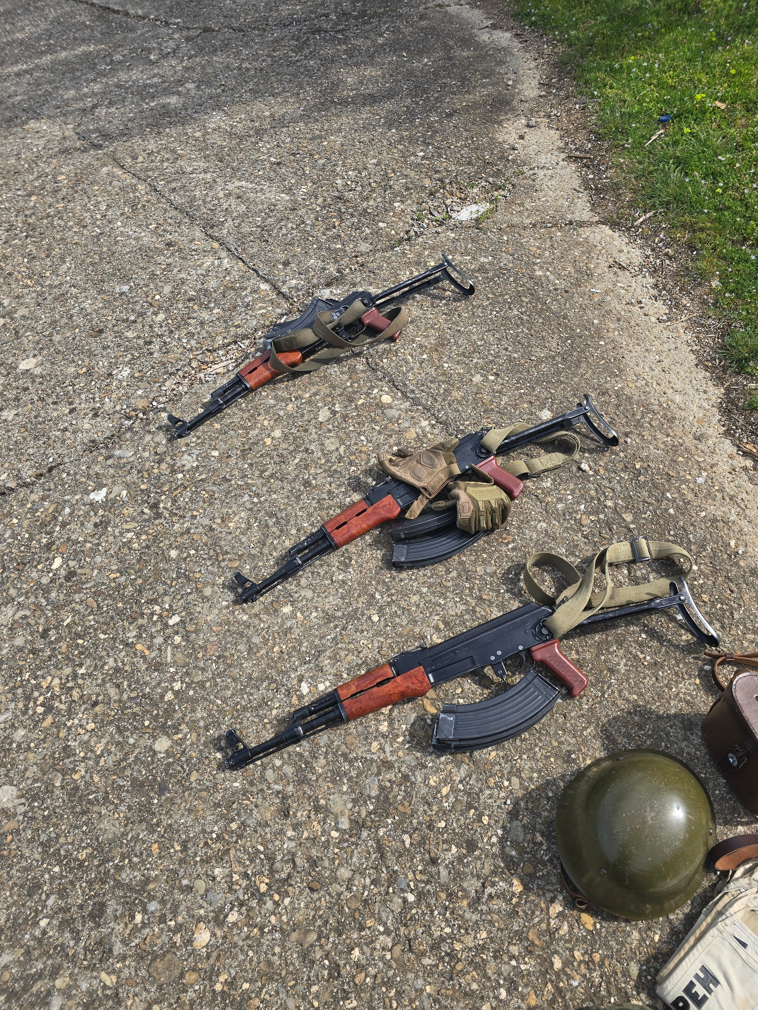 The image depicts a concrete surface with three AK-47 rifles laid out in a row, decreasing in size from right to left. Each rifle has a folding stock, and some have canvas straps. The central rifle ha…read more