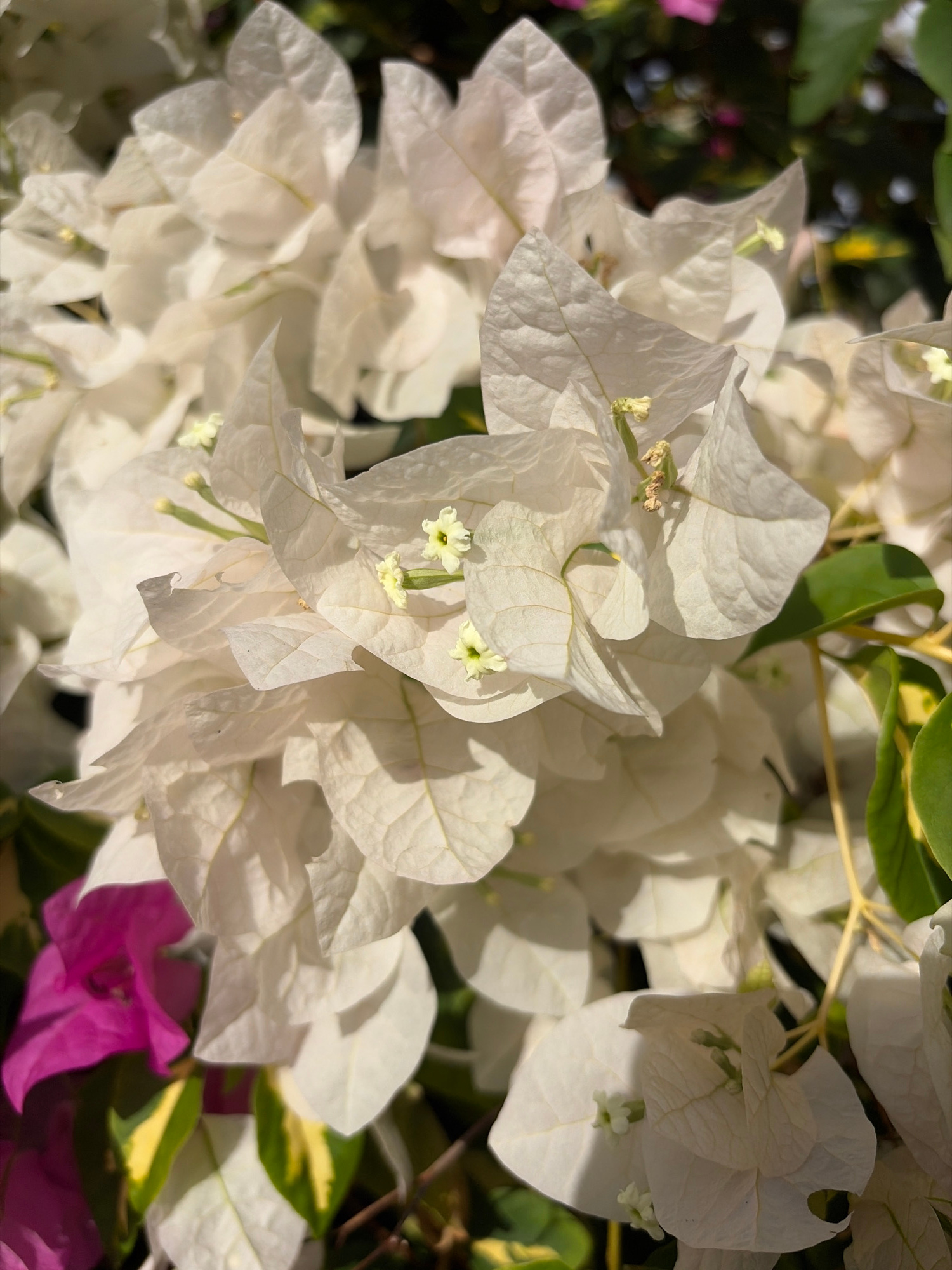 The image depicts a cluster of white bougainvillea flowers in close-up. The flowers appear papery and delicate with visible veins. Interspersed among the white bracts are a few green and yellow varieg…read more