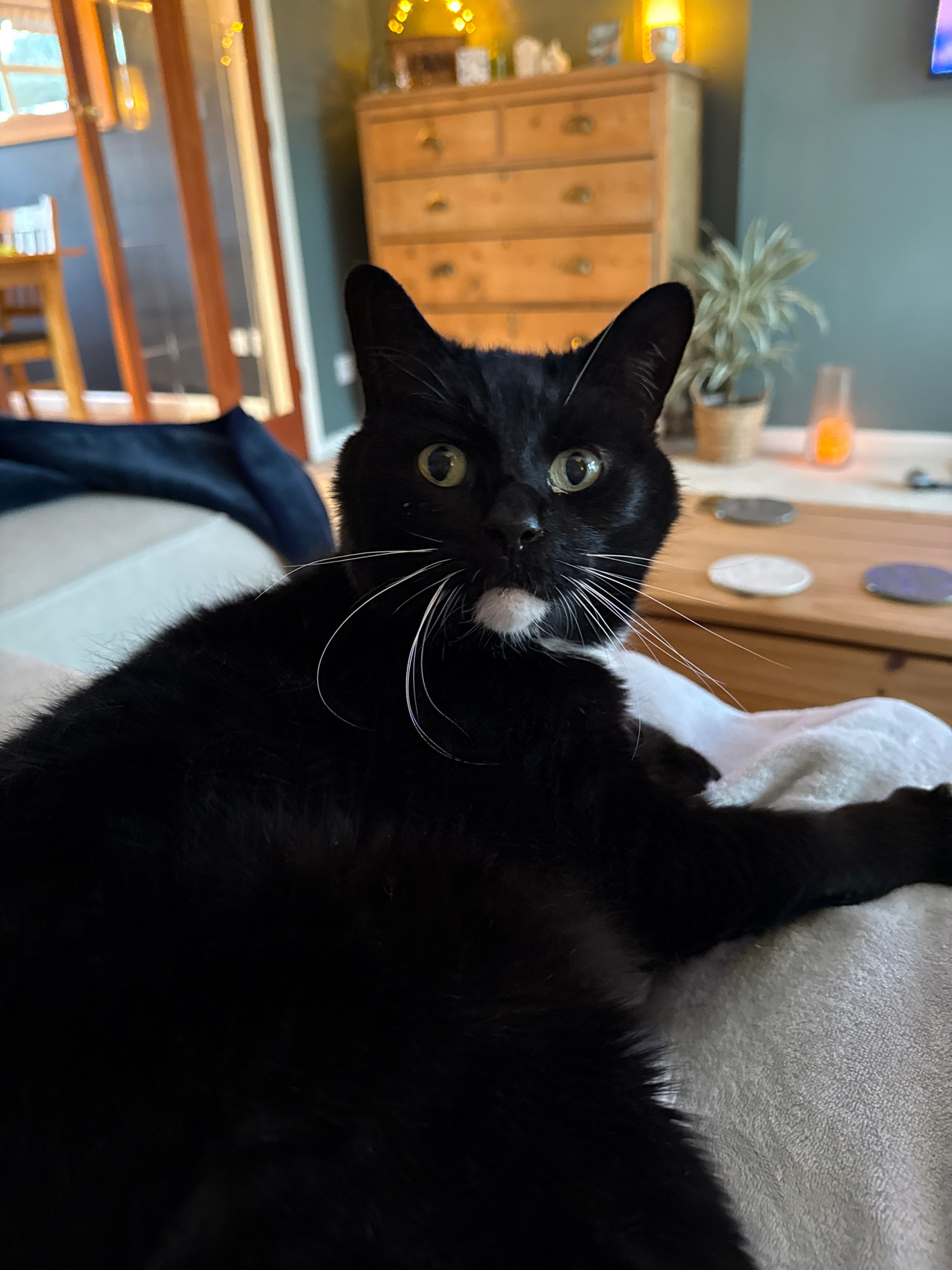 The image depicts a black cat with a small white spot on its face, lying on a light-colored surface, possibly a sofa or blanket. The cat has bright green eyes and long white whiskers. The background i…read more