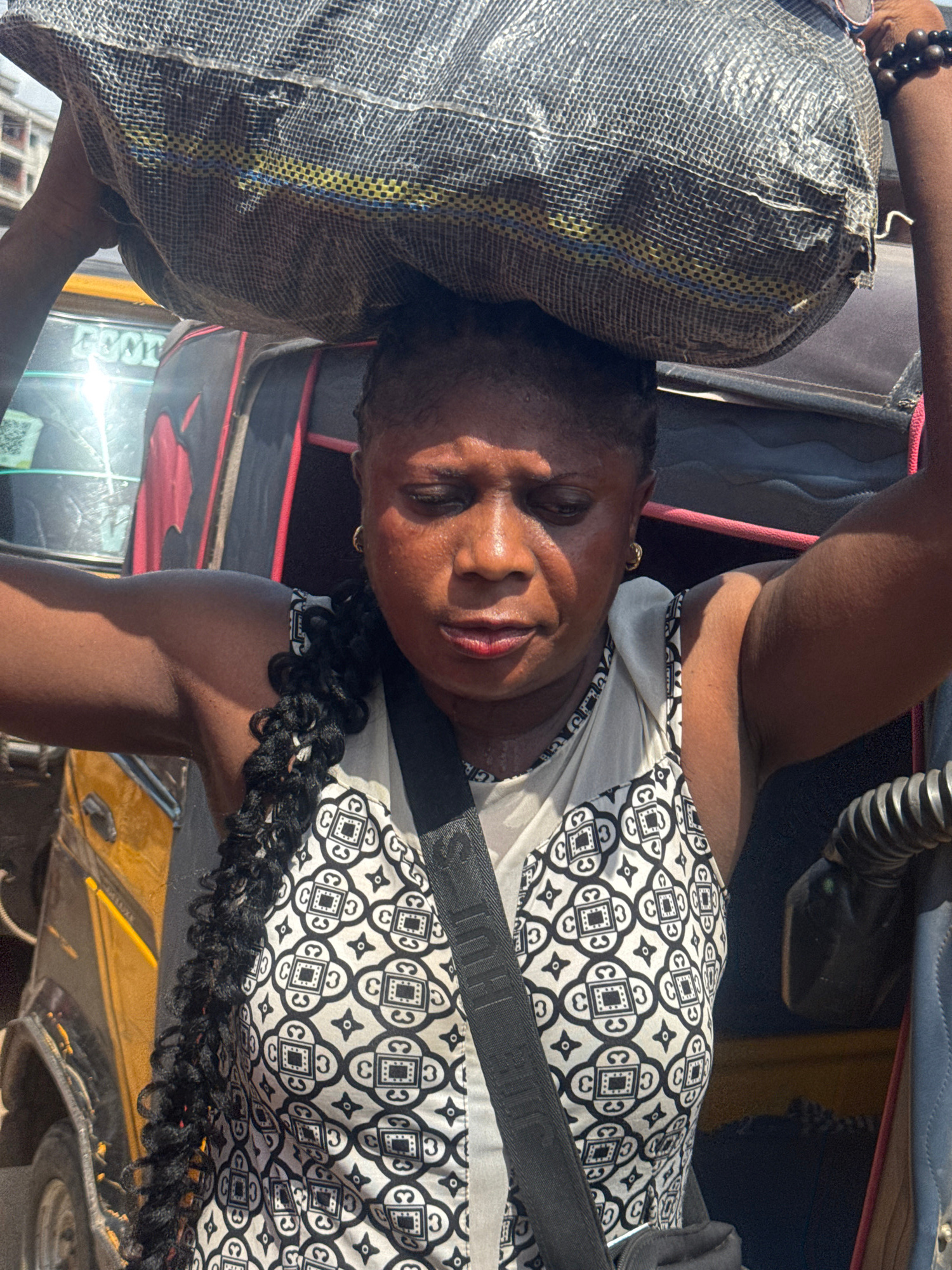 An image, rotated 90 degrees, depicts a person, likely a woman, seated in what appears to be a vehicle in Onitsha, Nigeria. She has dark skin and is looking towards the camera with a relaxed expressio…read more