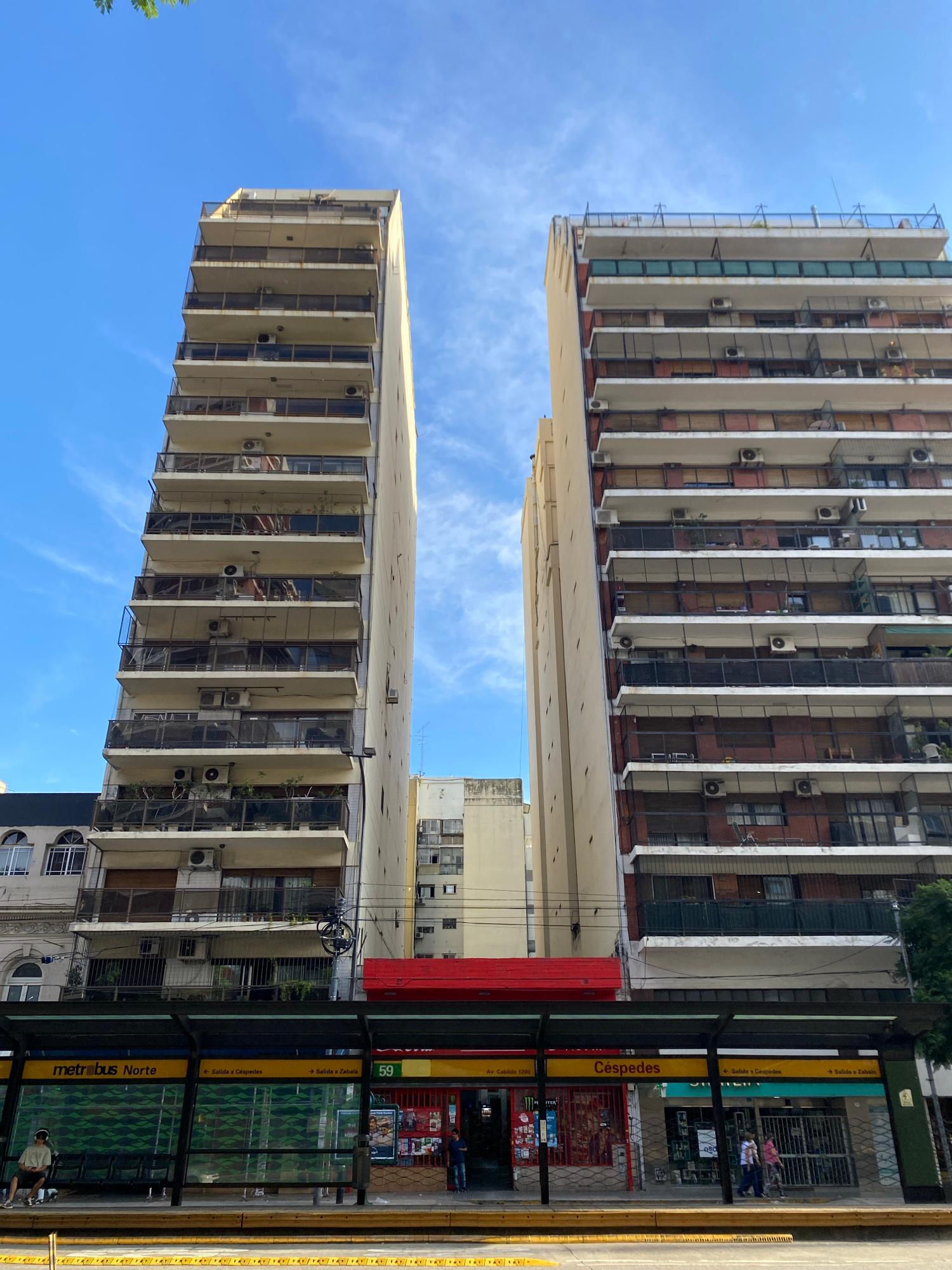 The image captures a street scene in Buenos Aires, Argentina, featuring two tall apartment buildings rising high against a clear blue sky. The buildings are characterized by rows of balconies, each ad…read more