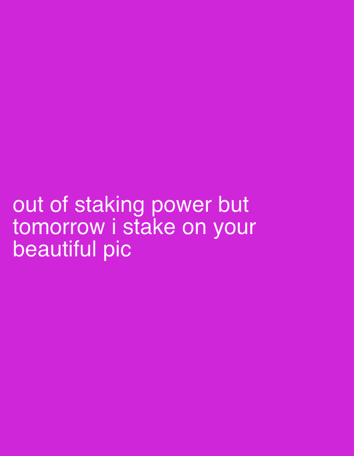 The image is a solid purple background with white text that reads "out of staking power but tomorrow i stake on your beautiful pic". The location is not discernible from the image content.