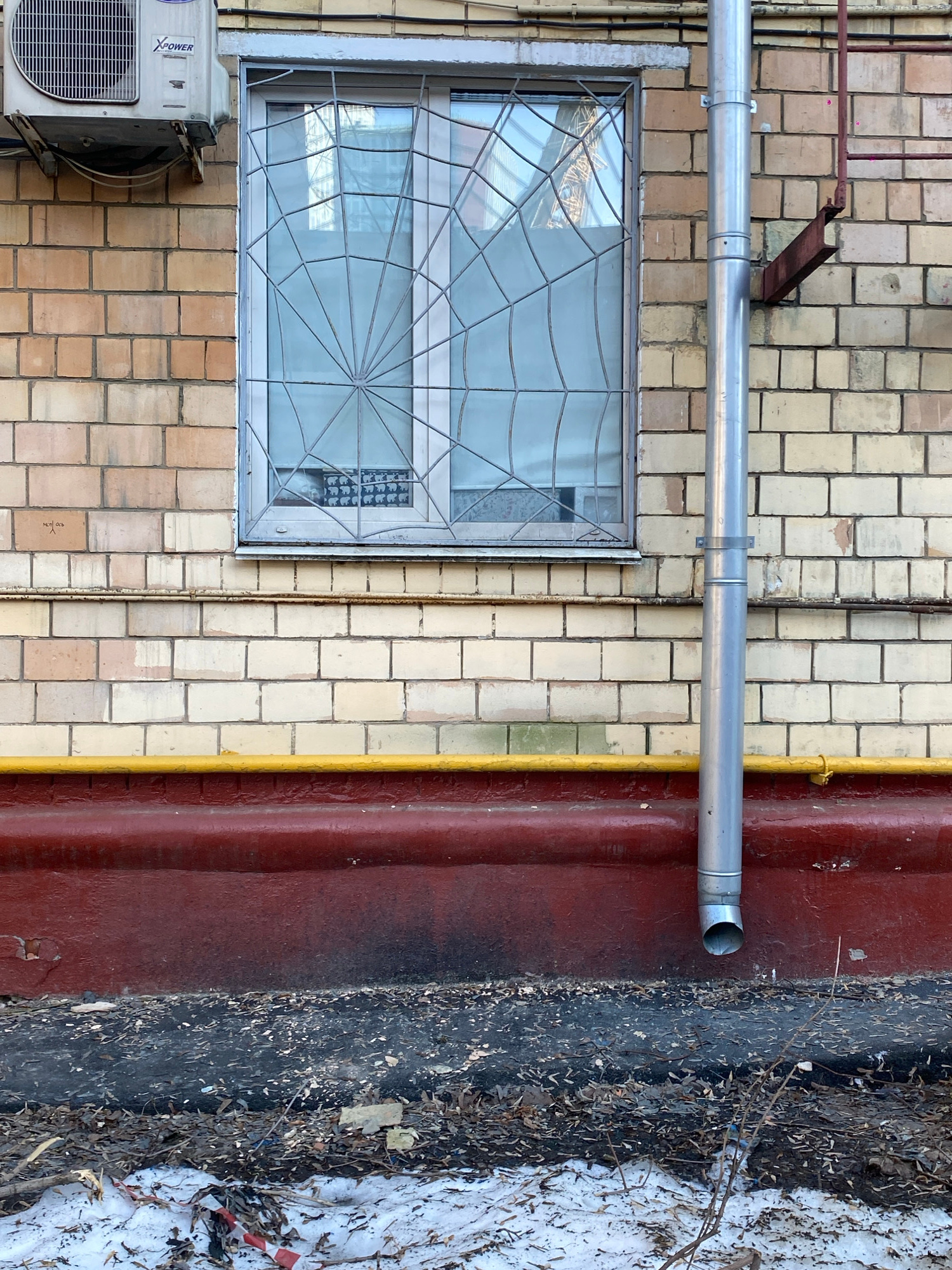 The image depicts the exterior of a building, possibly in Khimki, Russia. The structure is constructed of tan and yellow bricks. A metal pipe runs horizontally along the wall, secured with metal brack…read more